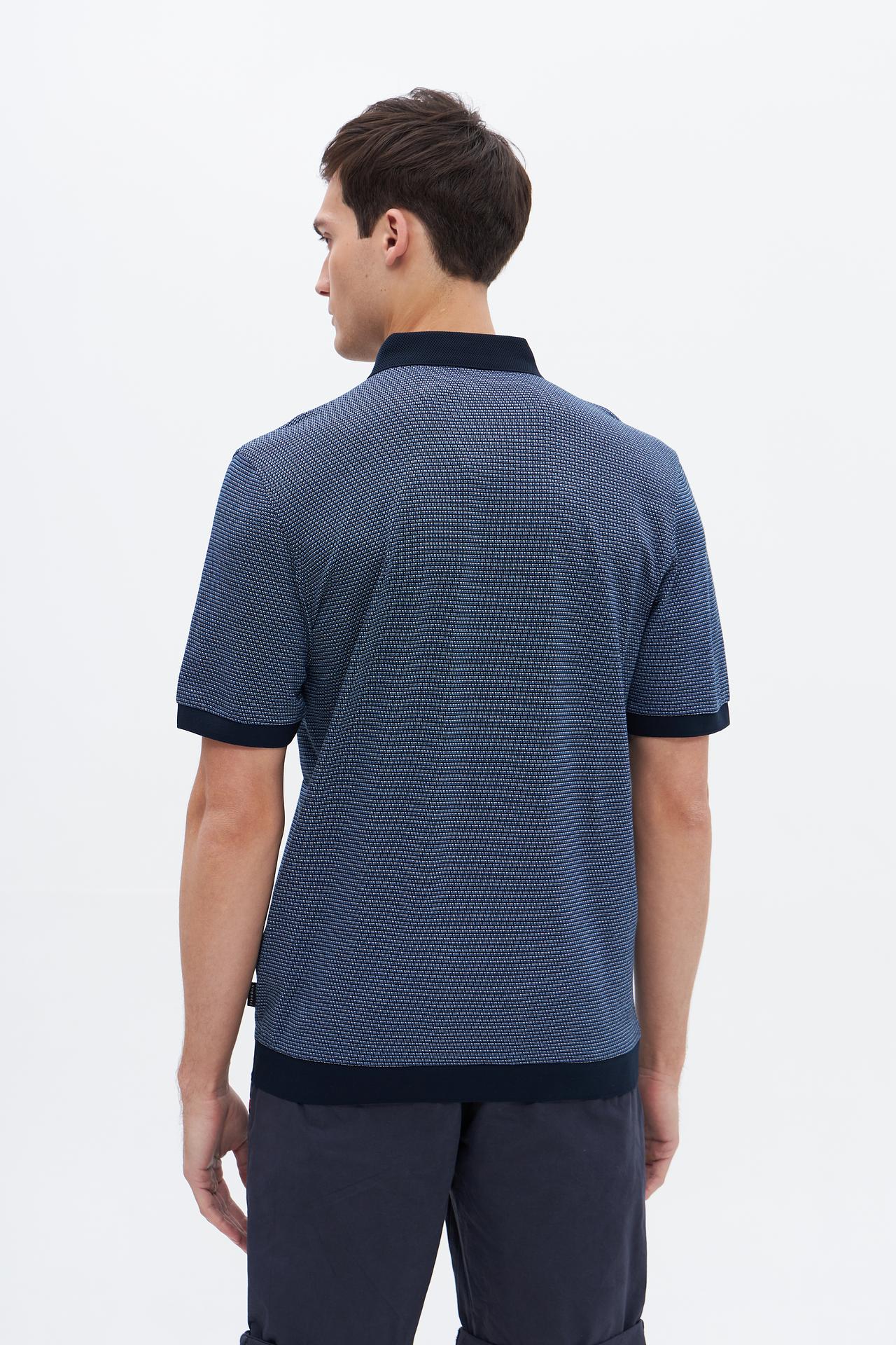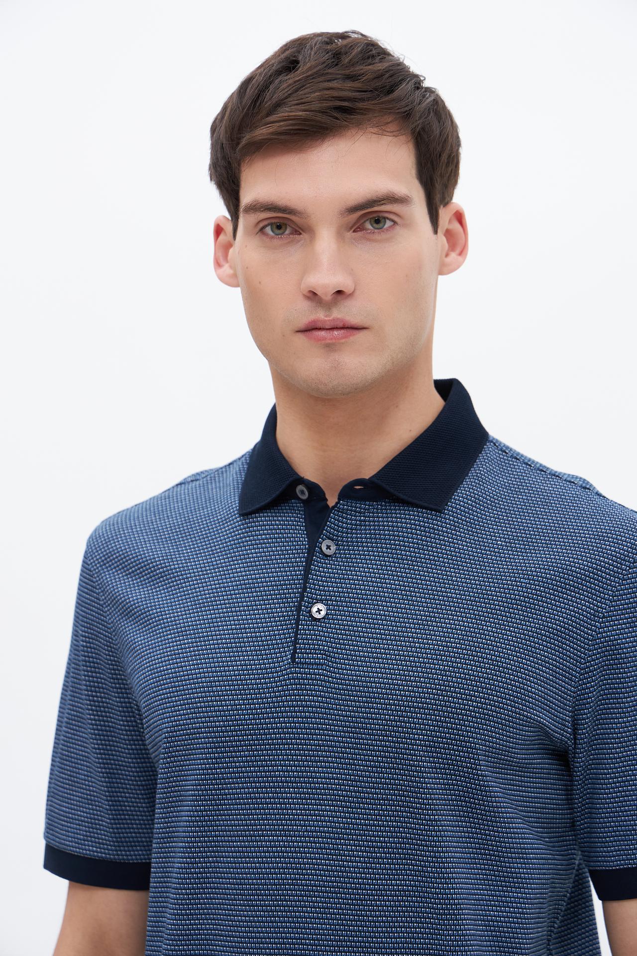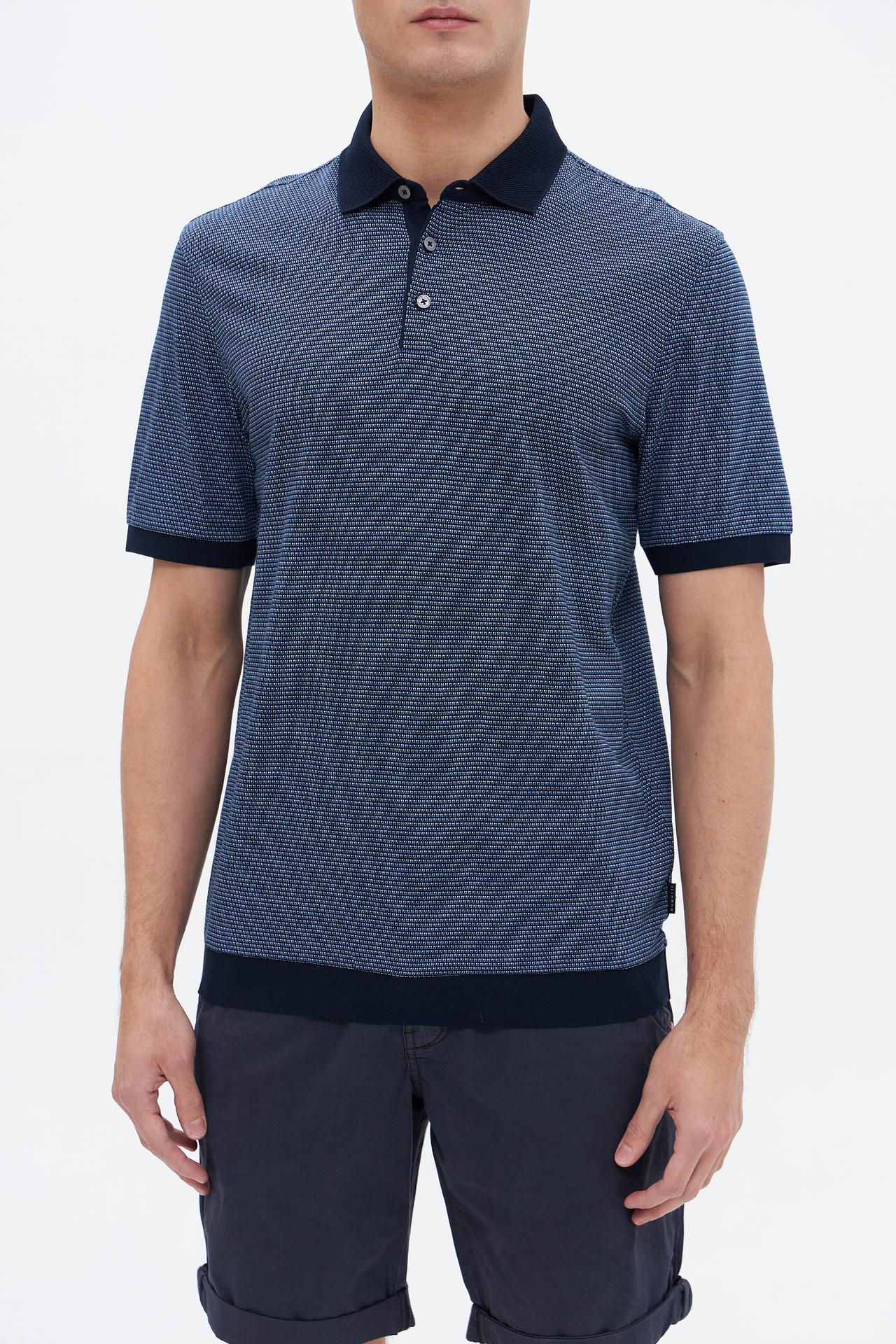 Изысканный геометрический узор по всей поверхности придает мужскому поло уникальный вид, а контрастные темно-синие детали на воротнике, манжетах и подоле подчеркивают внимание к деталям и премиальное качество бренда Bugatti.