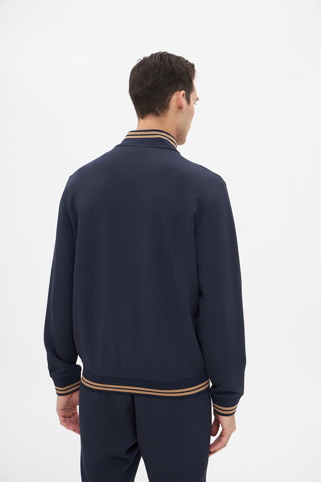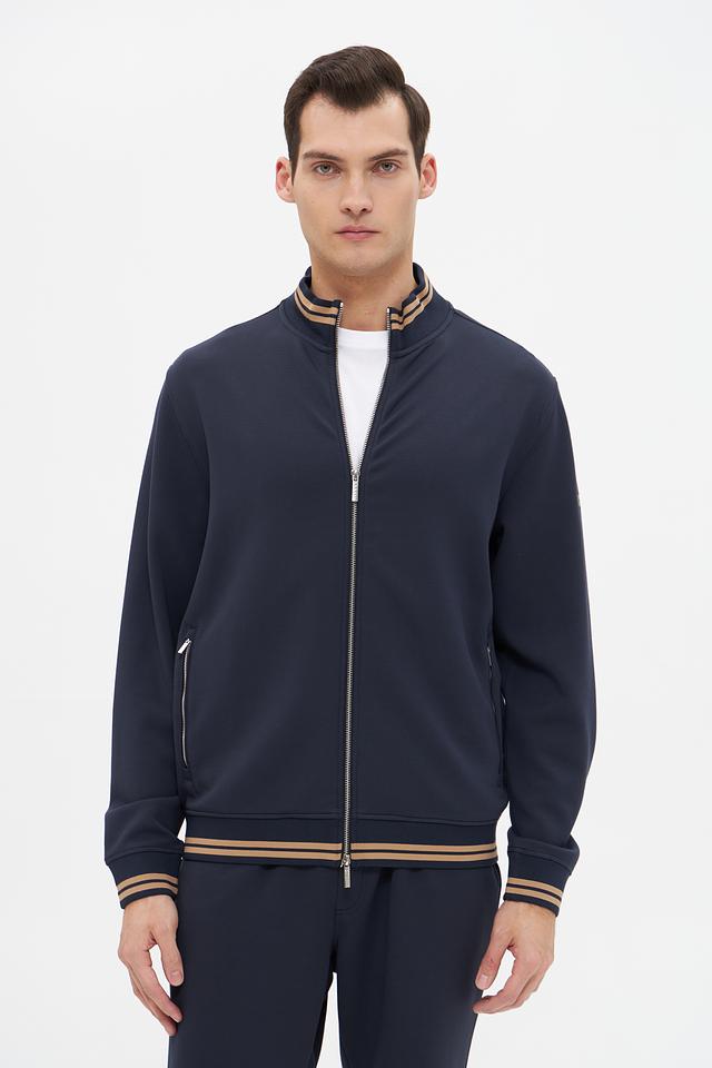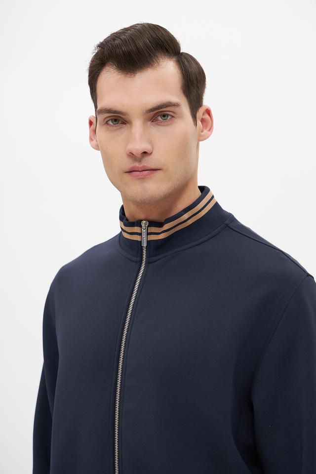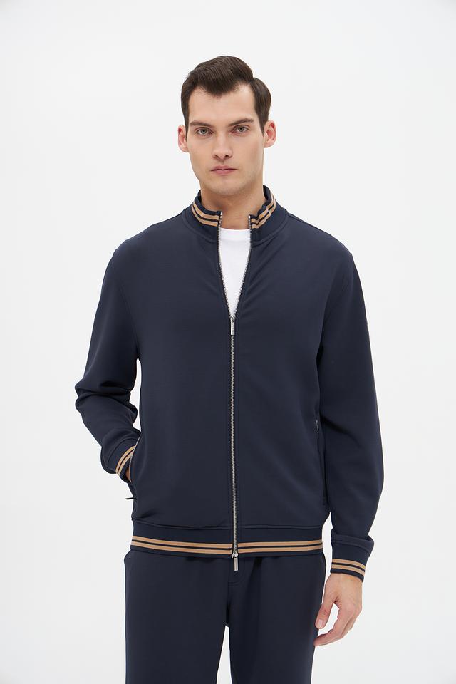 Модель имеет удобную застёжку-молнию, воротник-стойку и манжеты с тонкой полоской в бежево-золотистом цвете, что придает ей особый шарм. Кардиган выполнен из высококачественного модала, полиэстера и эластана, обеспечивающих мягкость, комфорт и хорошую посадку по фигуре.