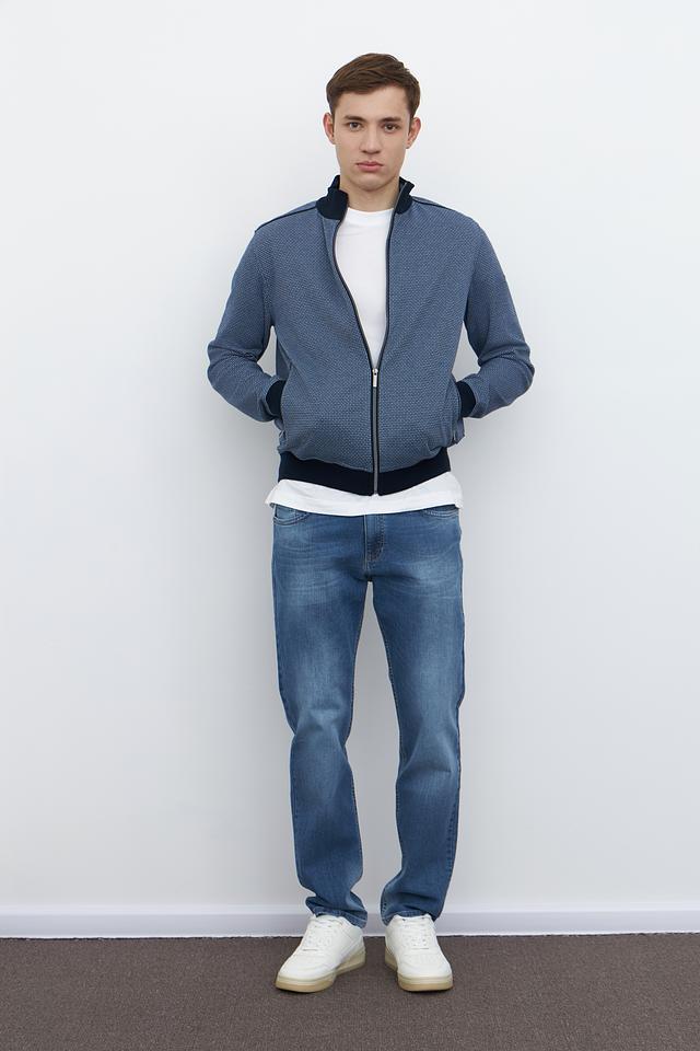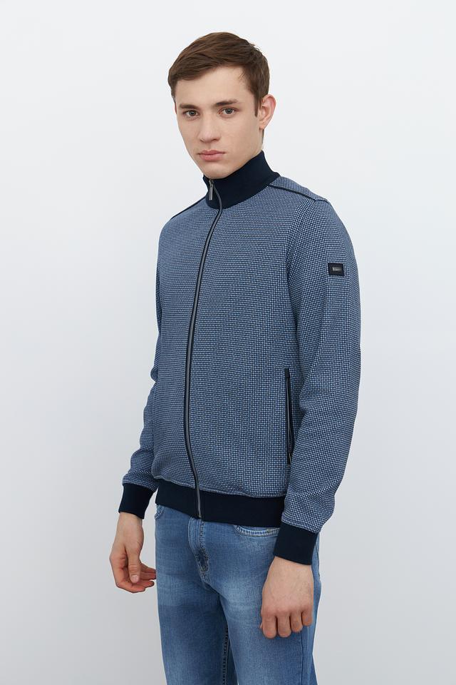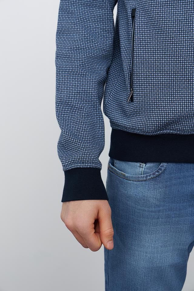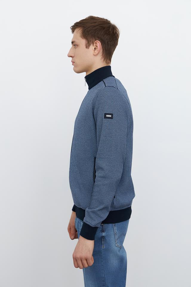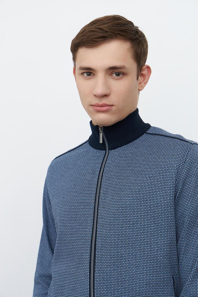 Кардиган имеет классический крой с застежкой-молнией, что позволяет легко регулировать степень тепла. Синий цвет с мелким геометрическим рисунком придает изделию современный и стильный вид. Эластичные манжеты и нижний край обеспечивают плотное прилегание, а также дополнительный комфорт.