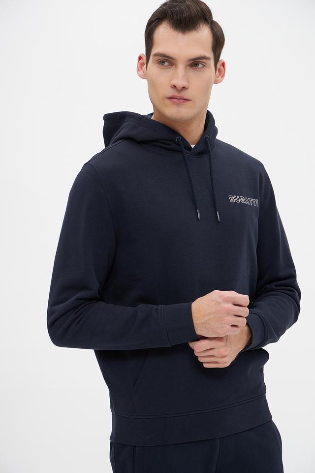 Мужское худи Bugatti тёмно-синего цвета с логотипом бренда на груди. Модель выполнена из мягкого хлопка с добавлением полиэстера для комфорта и долговечности. Идеальный выбор для повседневного образа. Состав: хлопок 87%, полиэстер 13%