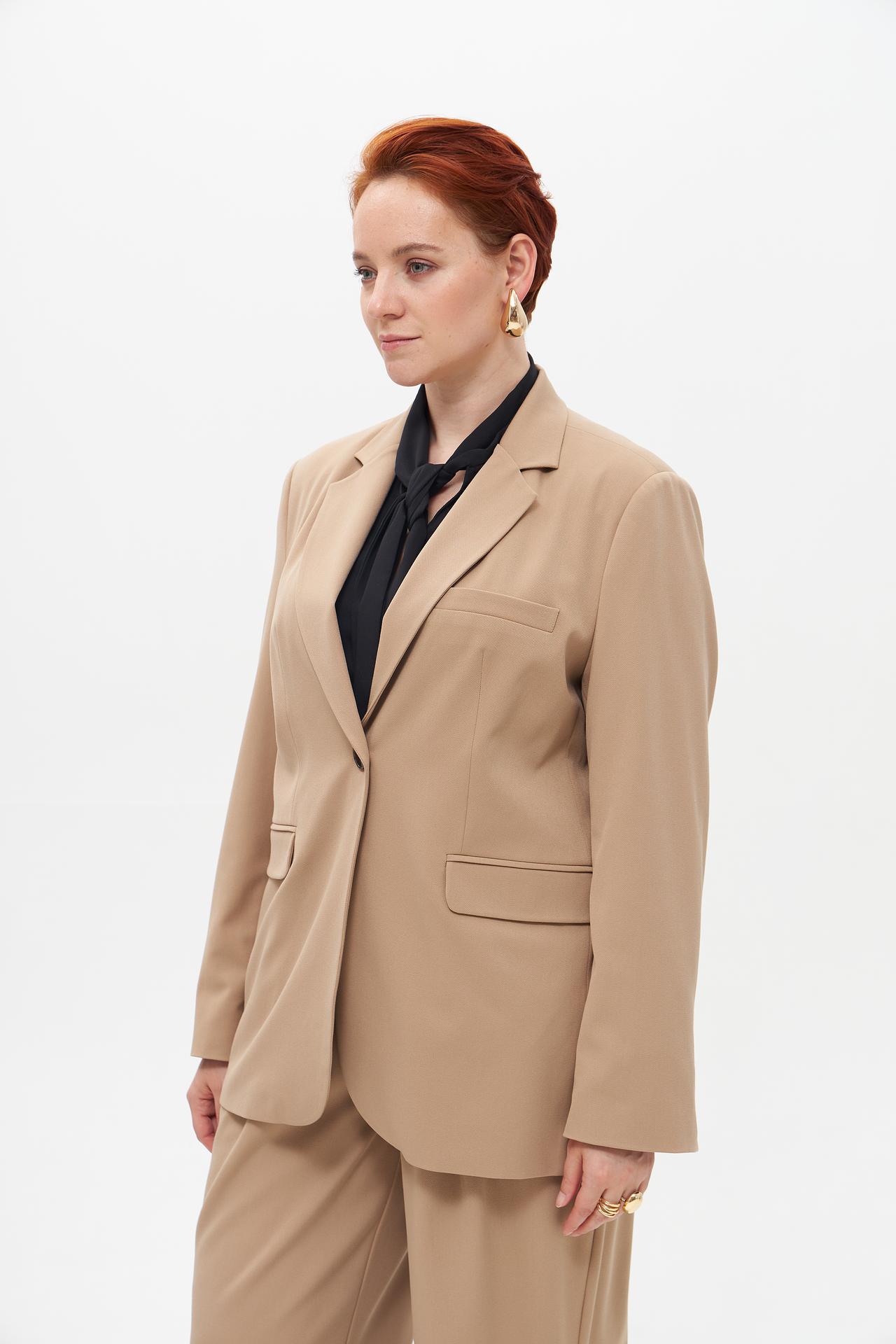 - Детализация и функциональность. Однобортная застежка на одну пуговицу, классические лацканы и функциональные прорезные карманы придают жакету завершенный и деловой вид. Нагрудный карман добавляет элегантности.