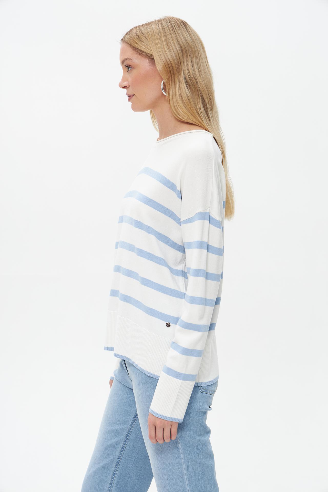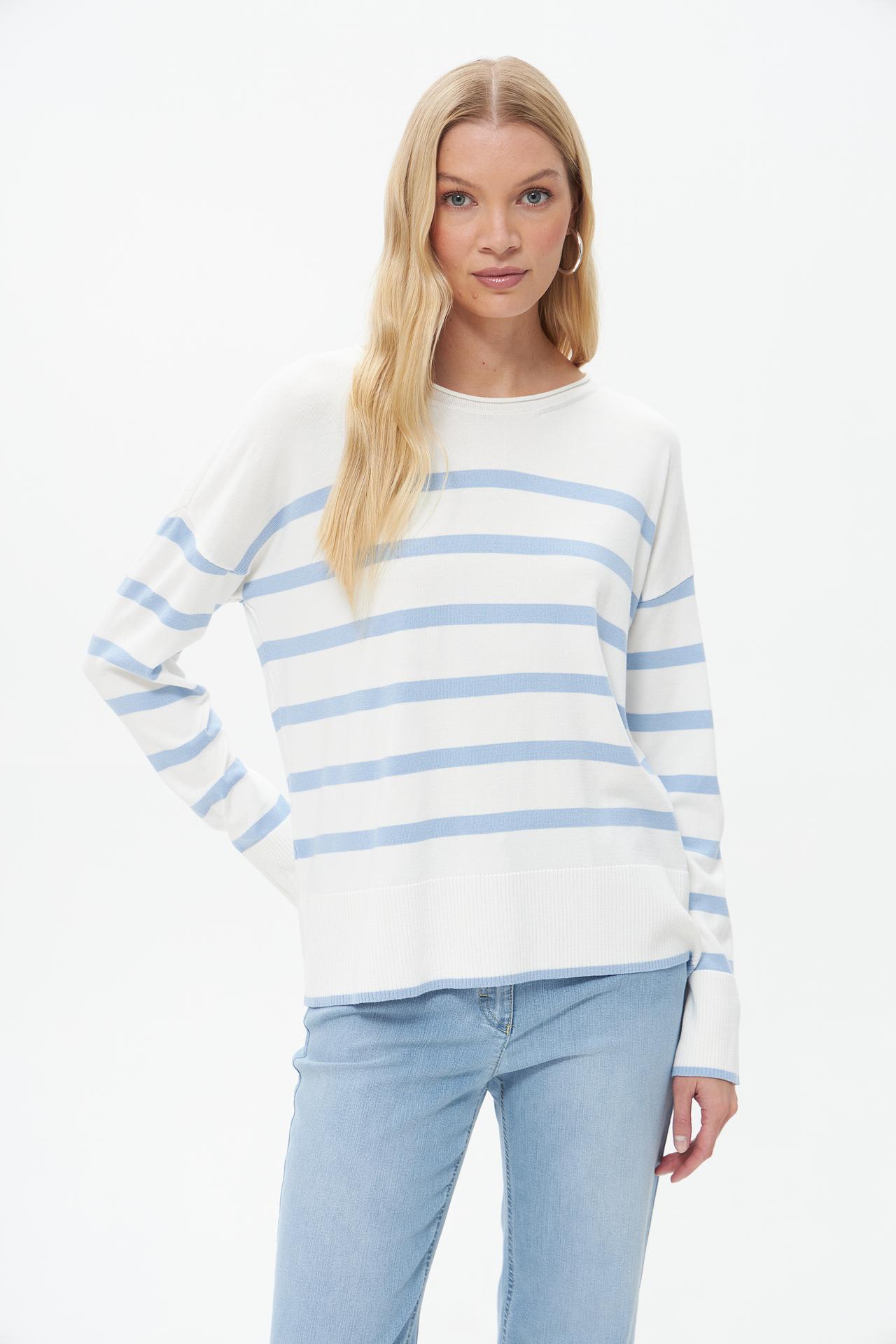 - Лаконичный дизайн: Пуловер выполнен с круглым вырезом и имеет прямой, слегка свободный крой, что обеспечивает комфорт и не сковывает движений. Горизонтальные полосы создают классический и всегда актуальный морской стиль, идеально подходящий для любого сезона.