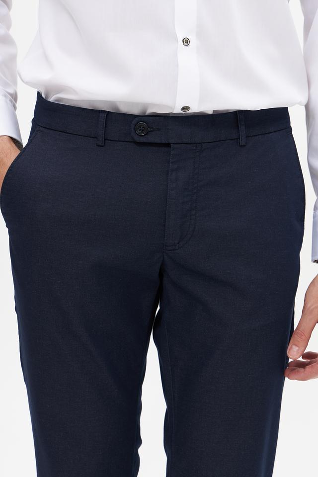 Основной цвет брюк – темно-синий, что делает их универсальными и подходящими для создания различных образов. Брюки имеют стандартную посадку на талии и застегиваются на молнию и пуговицу. На брюках присутствуют боковые и задние карманы.