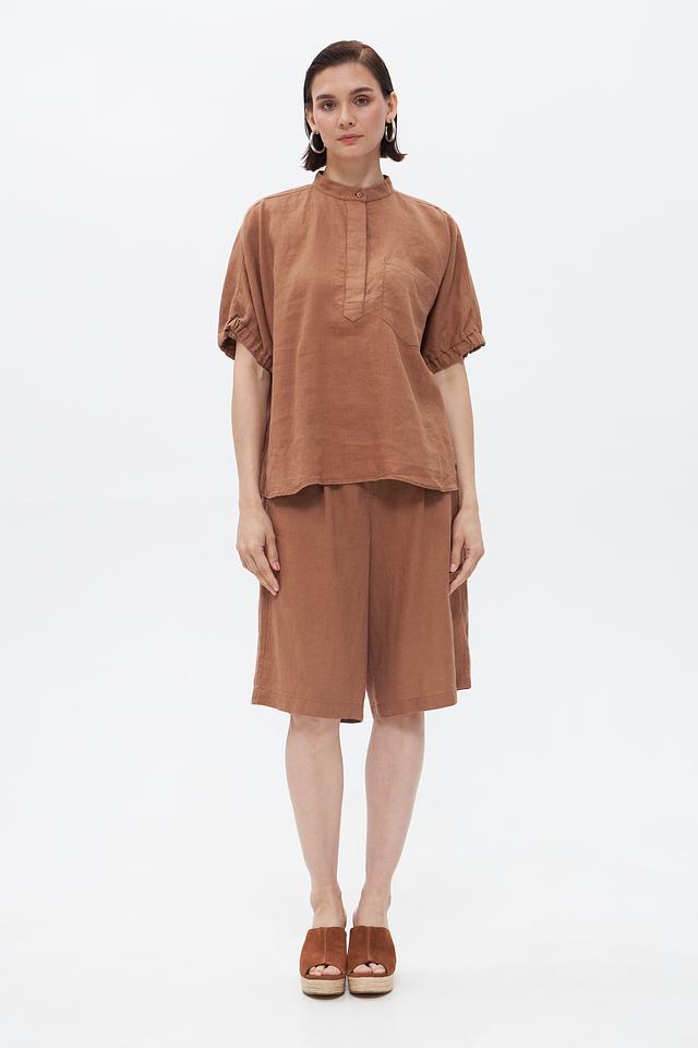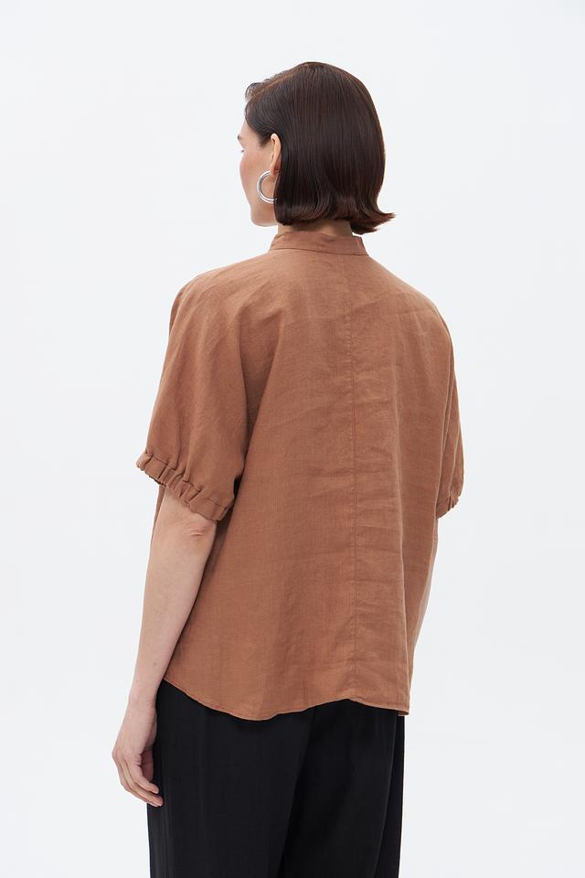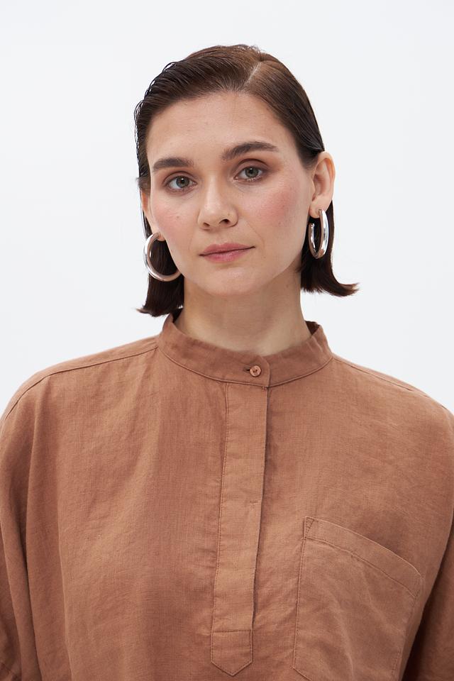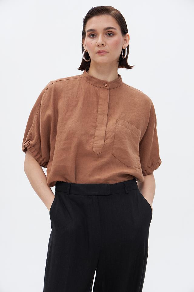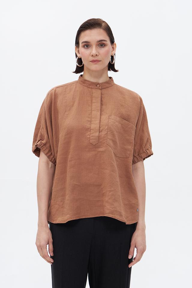 Коричневая блуза Bugatti из 100% льна – это стильное и комфортное решение для летнего гардероба. Модель с короткими рукавами и воротником-стойкой отличается свободным кроем и удобной посадкой. Состав: лен 100%