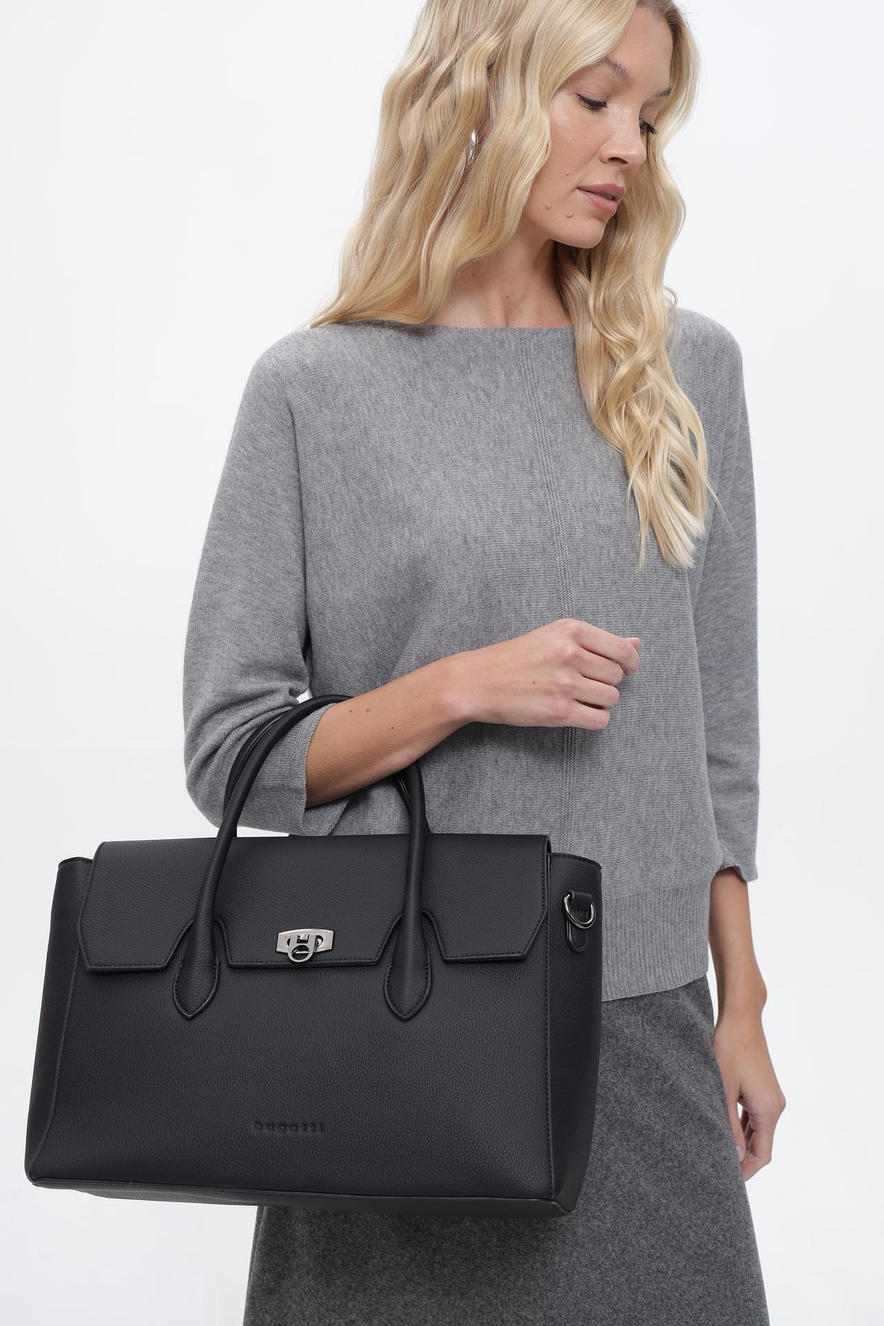 Элегантная женская сумка от бренда Bugatti, выполненная в классическом черном цвете. Изделие изготовлено из 100% полиуретана, что обеспечивает долговечность и простоту в уходе. Эта модель идеально подходит для создания деловых и повседневных образов, добавляя им изысканности и стиля.