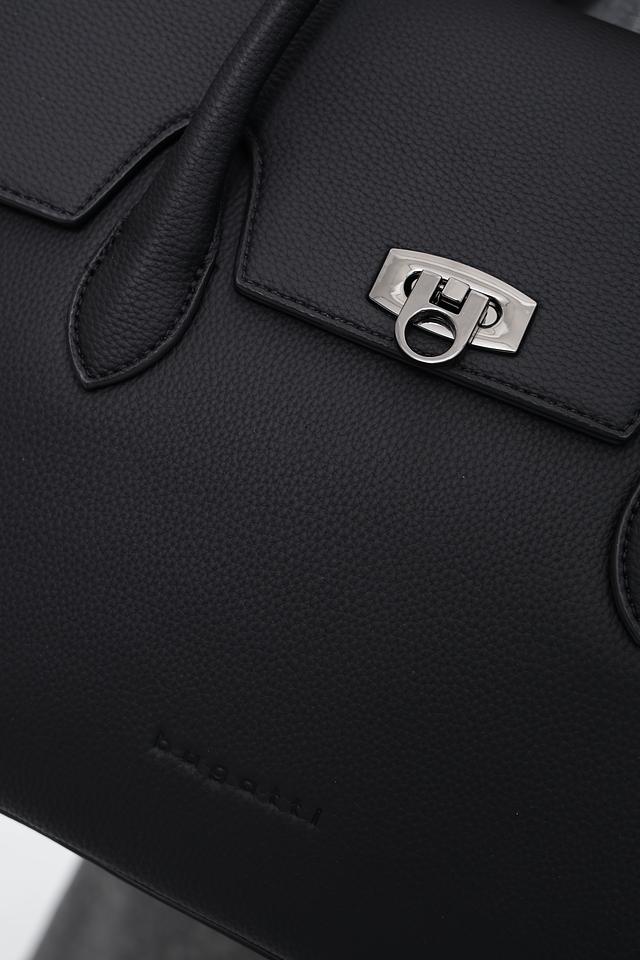 Женская сумка от Bugatti выполнена из высококачественного полиуретана в классическом чёрном цвете. Модель имеет прямоугольную форму с закругленными углами и аккуратными линиями.
