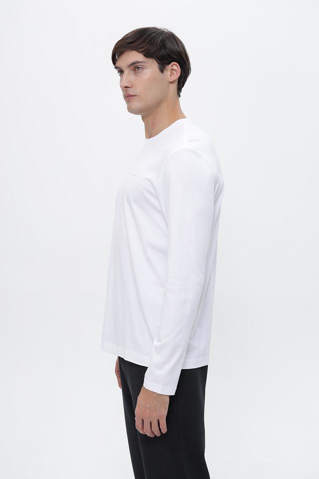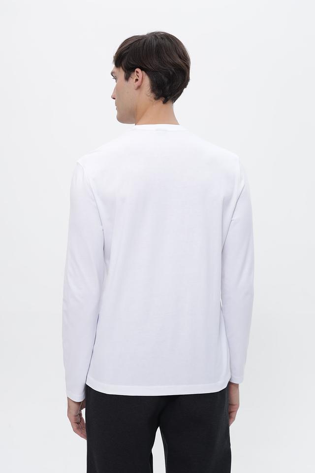 Лонгслив имеет лаконичный дизайн, дополненный небольшим логотипом бренда на груди. На левом рукаве присутствует небольшая вертикальная полоса, добавляющая акцент. Белый цвет делает его универсальным и легко сочетаемым с другими элементами гардероба.