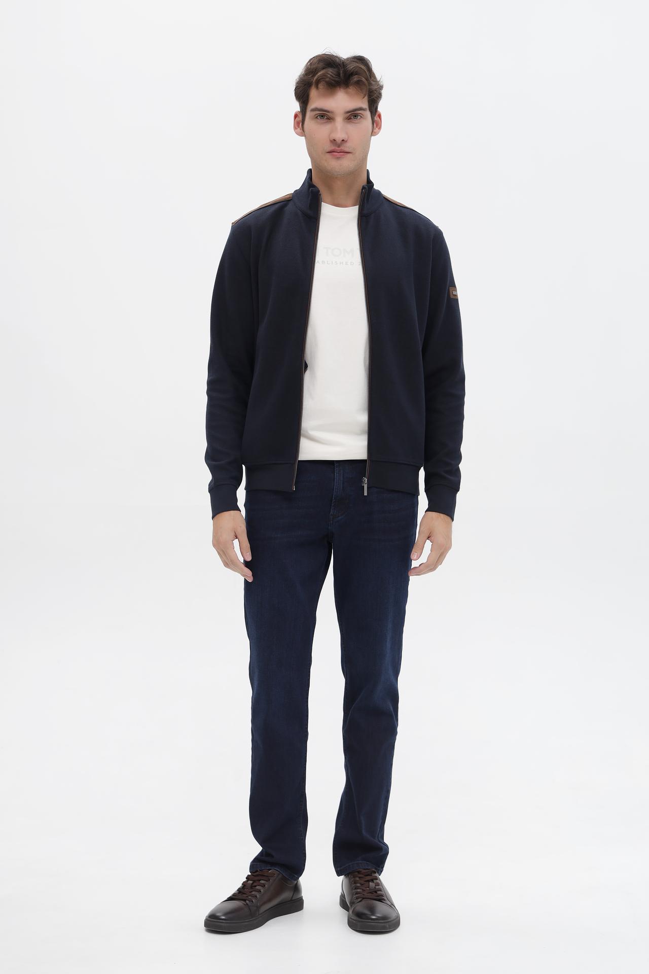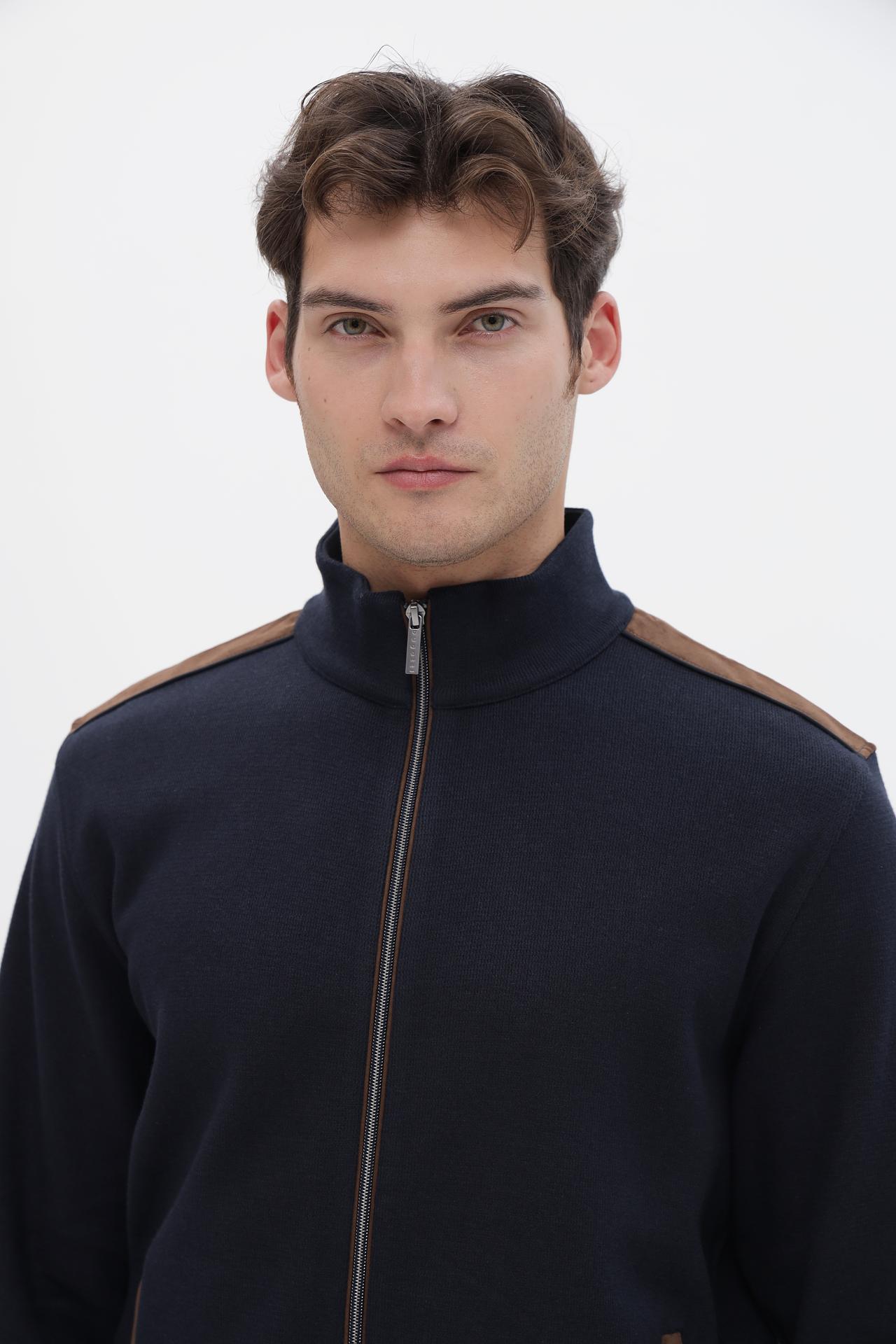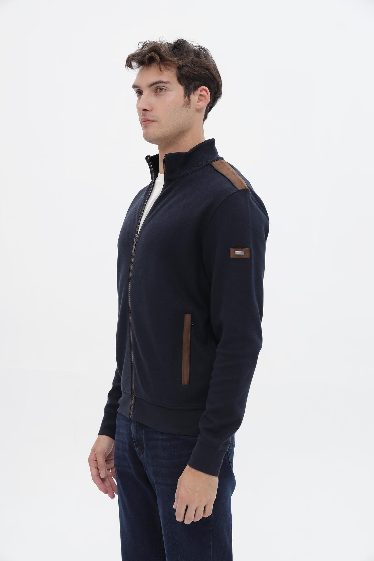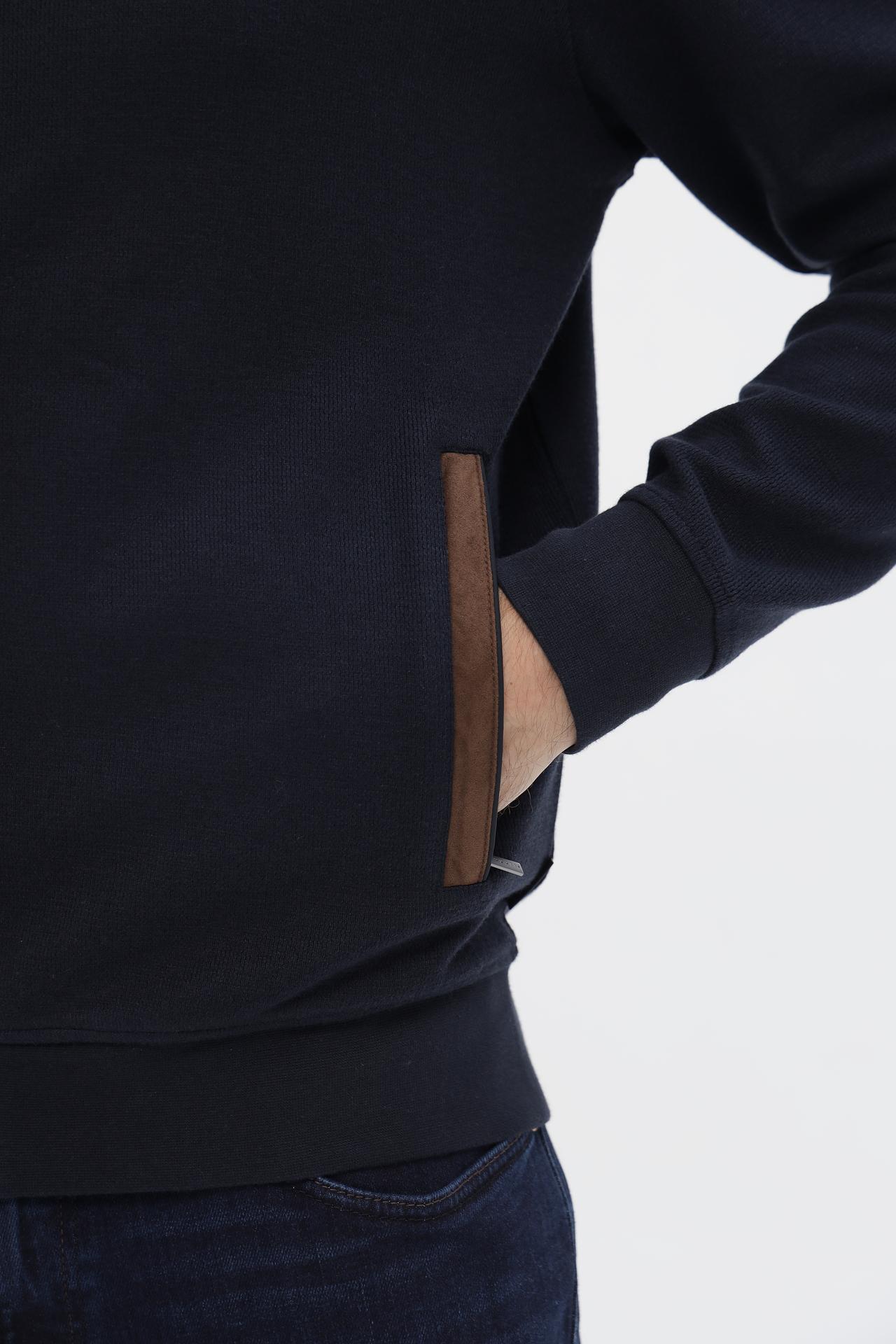 Элегантный мужской кардиган от Bugatti — идеальное дополнение к вашему повседневному и деловому гардеробу. Классический темно-синий цвет в сочетании с коричневыми кожаными вставками на плечах и по бокам карманов придает изделию утонченный и стильный вид. Этот кардиган станет вашим верным спутником в прохладные дни, обеспечивая комфорт и тепло.