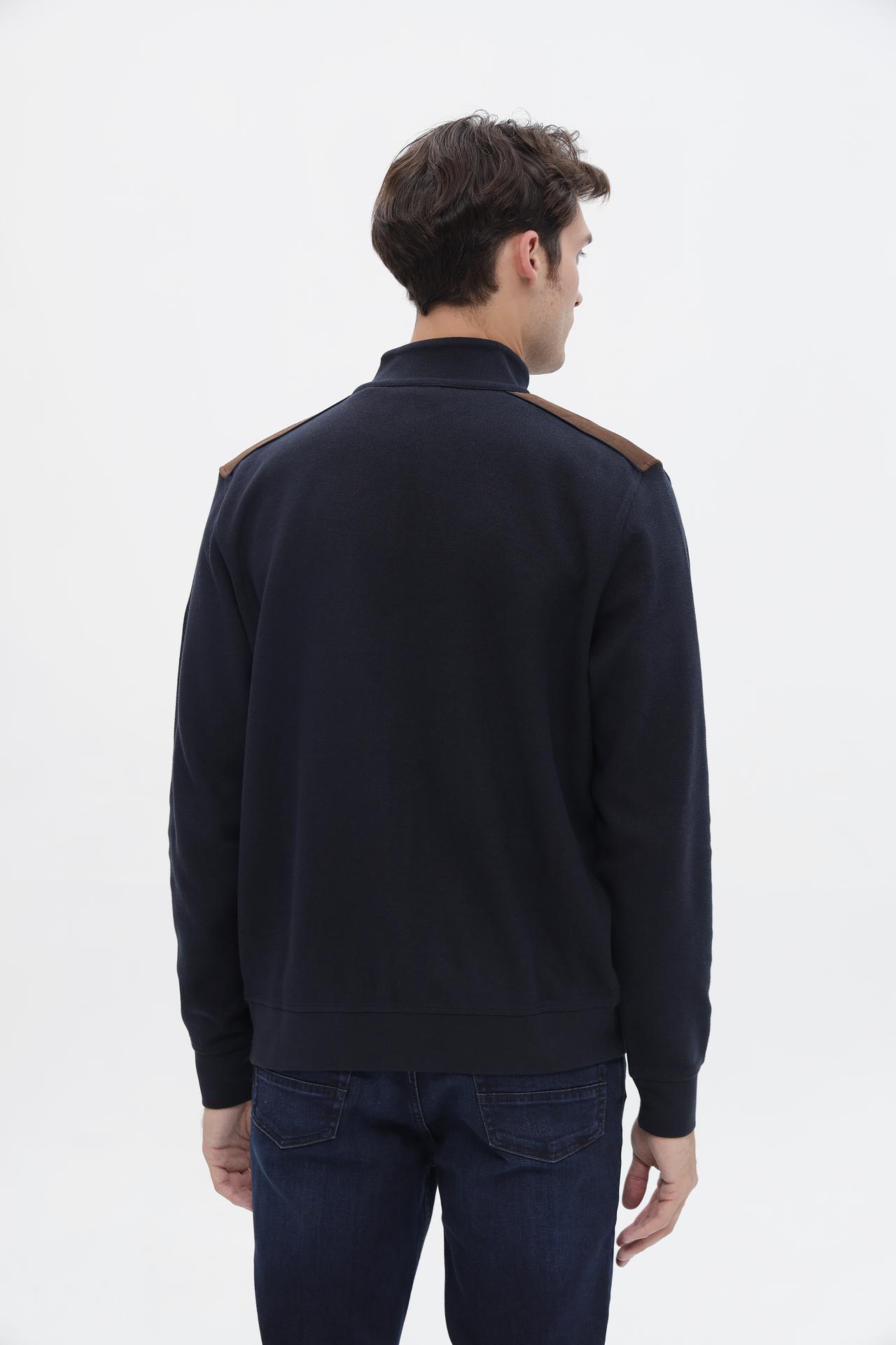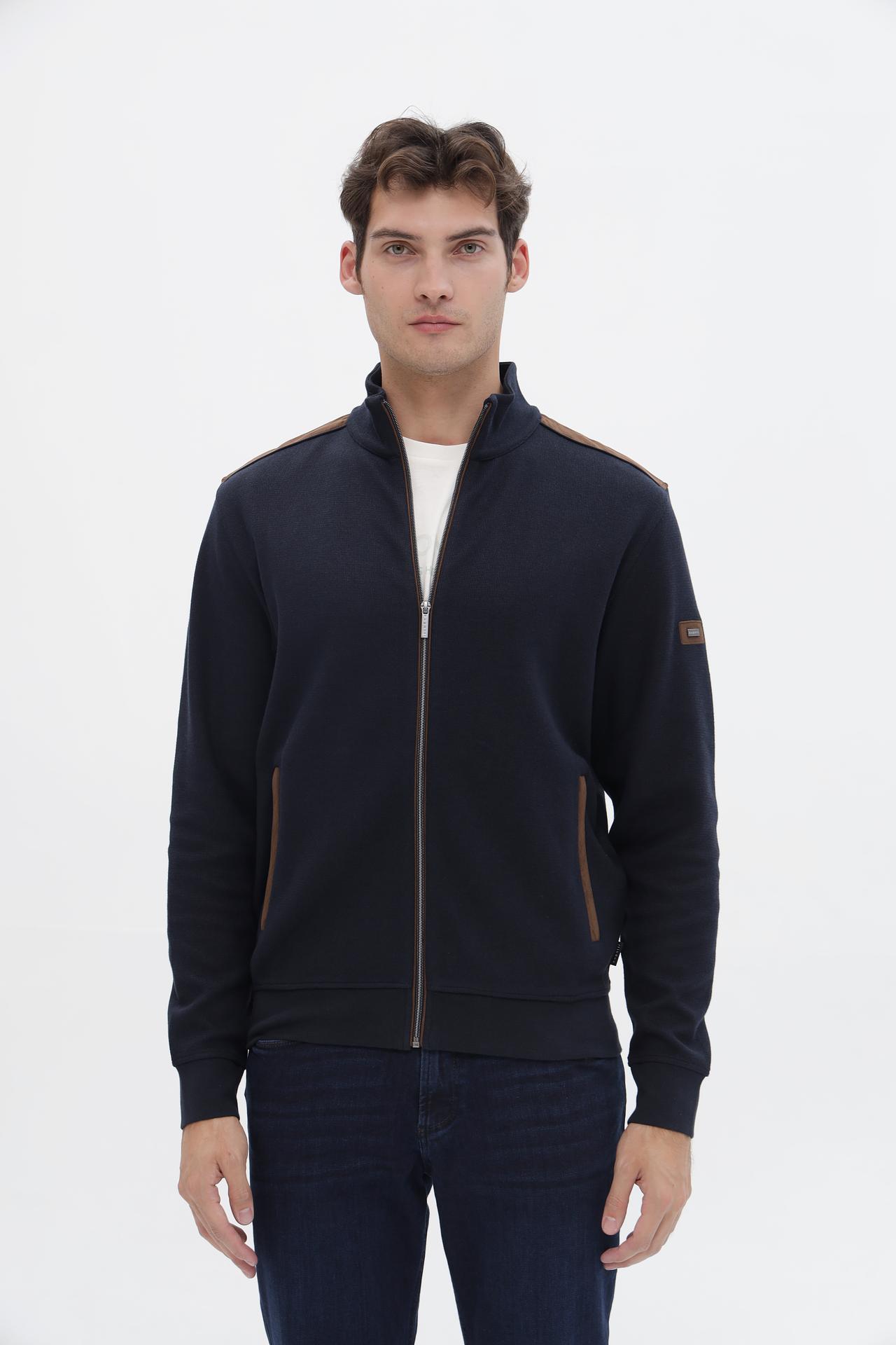 - Дизайн: Кардиган имеет современный прямой крой и высокий воротник-стойку, который защитит от ветра. Декоративные кожаные вставки на плечах и аккуратные вставки по краям карманов добавляют изысканности и подчеркивают премиальное качество бренда Bugatti.