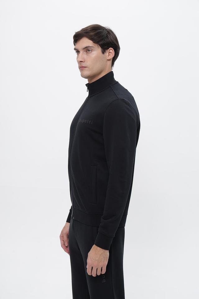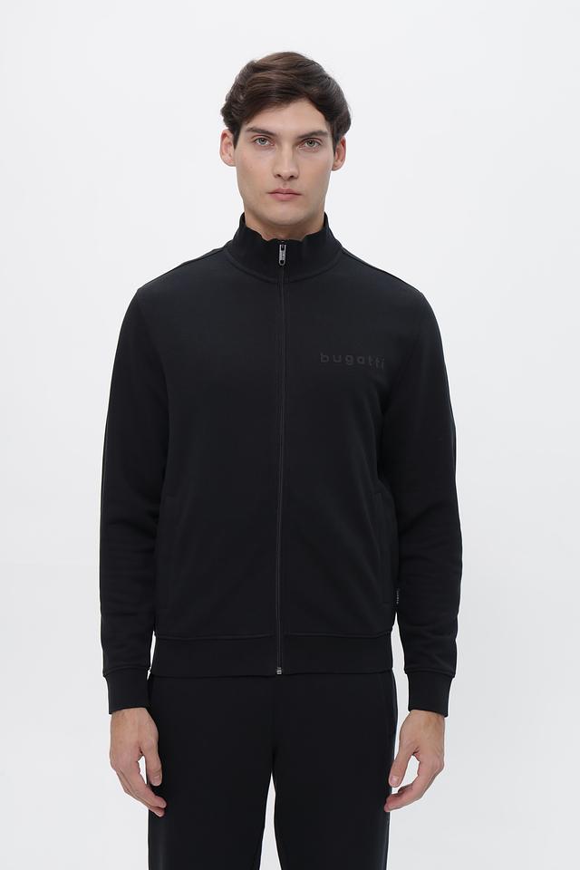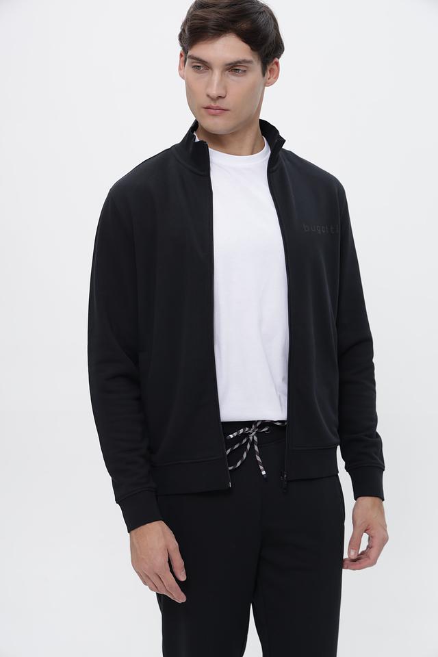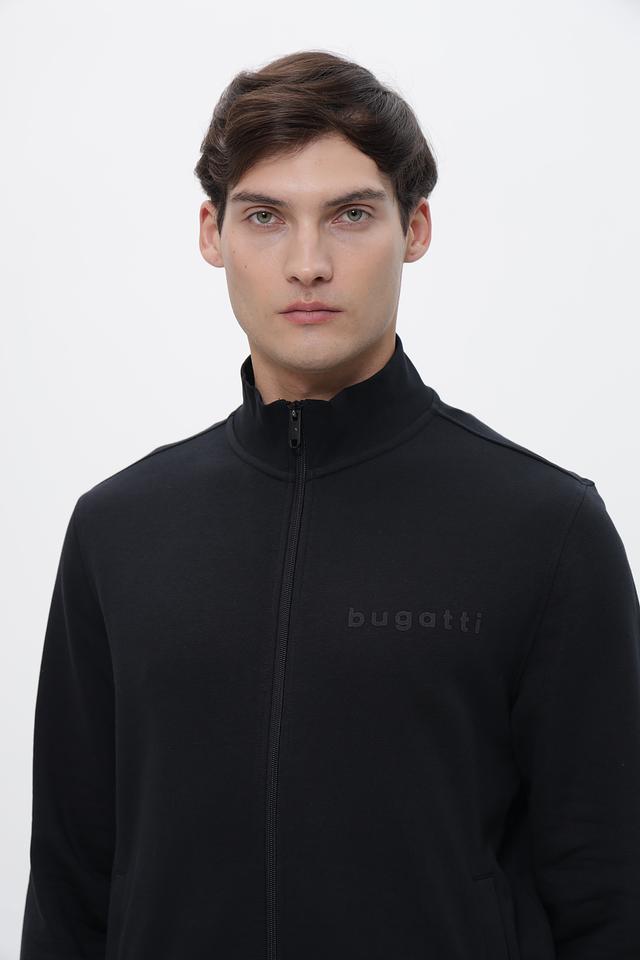 Мужской кардиган Bugatti классического кроя, выполнен в чёрном цвете. Модель застёгивается на молнию, имеет воротник-стойку и манжеты на рукавах. Логотип бренда Bugatti расположен на груди.
