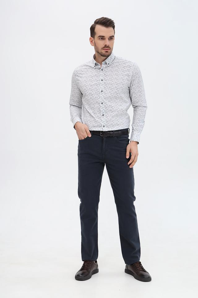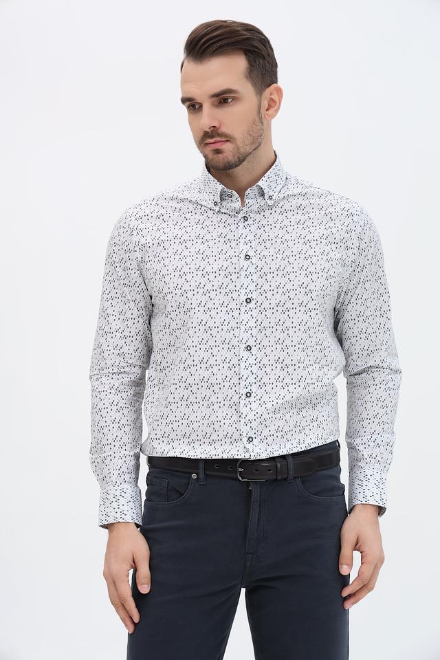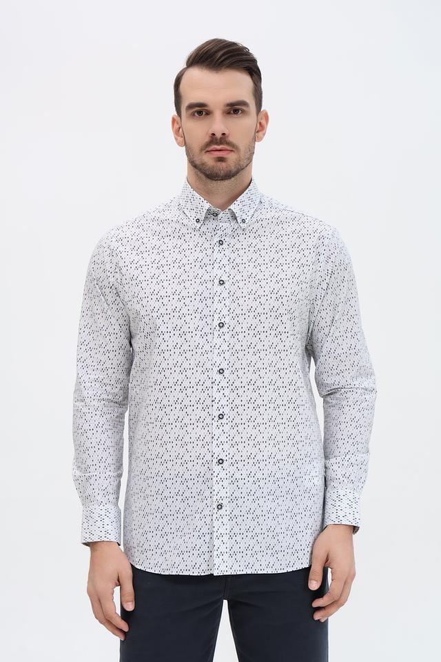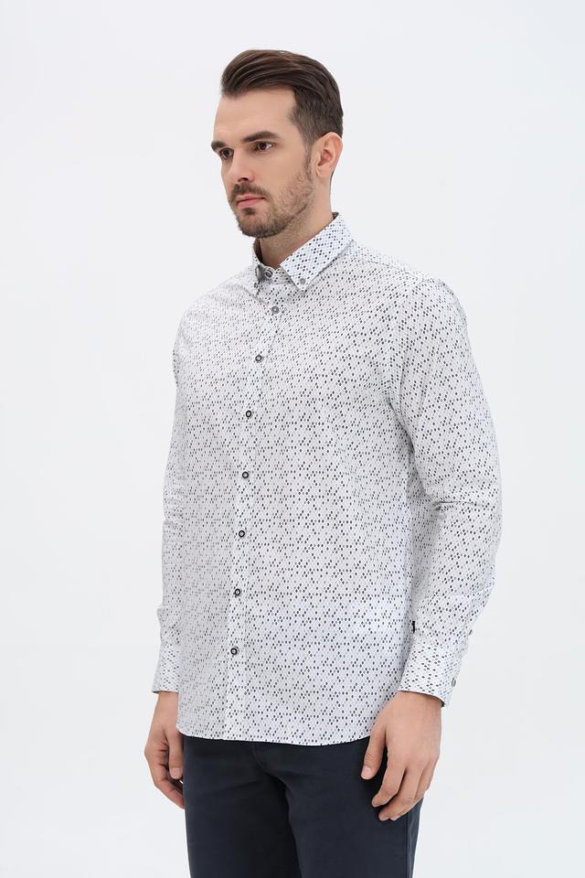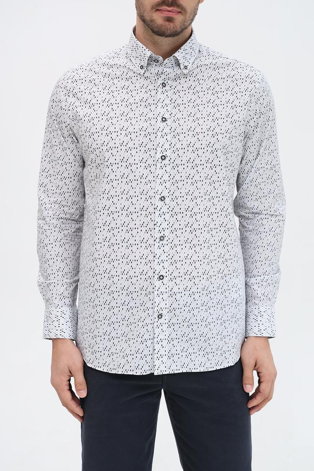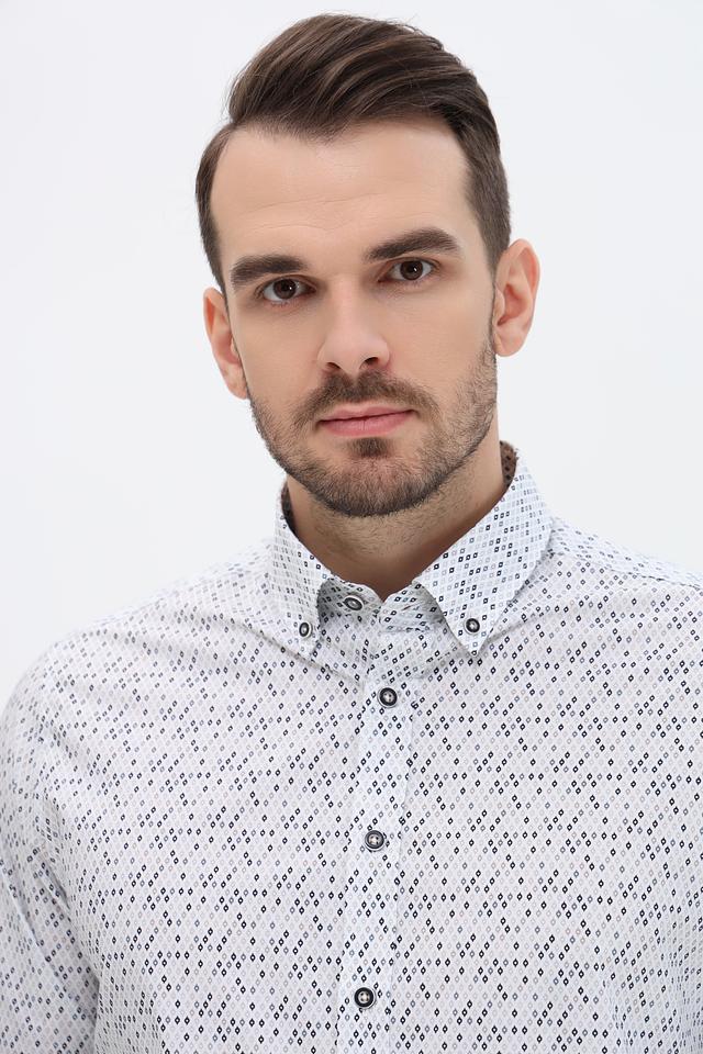 Рубашка имеет классический крой с длинными рукавами, манжетами на пуговицах и воротником на пуговицах. Особенностью модели является стильный принт, состоящий из мелких геометрических фигур в сине-черной гамме на белом фоне.