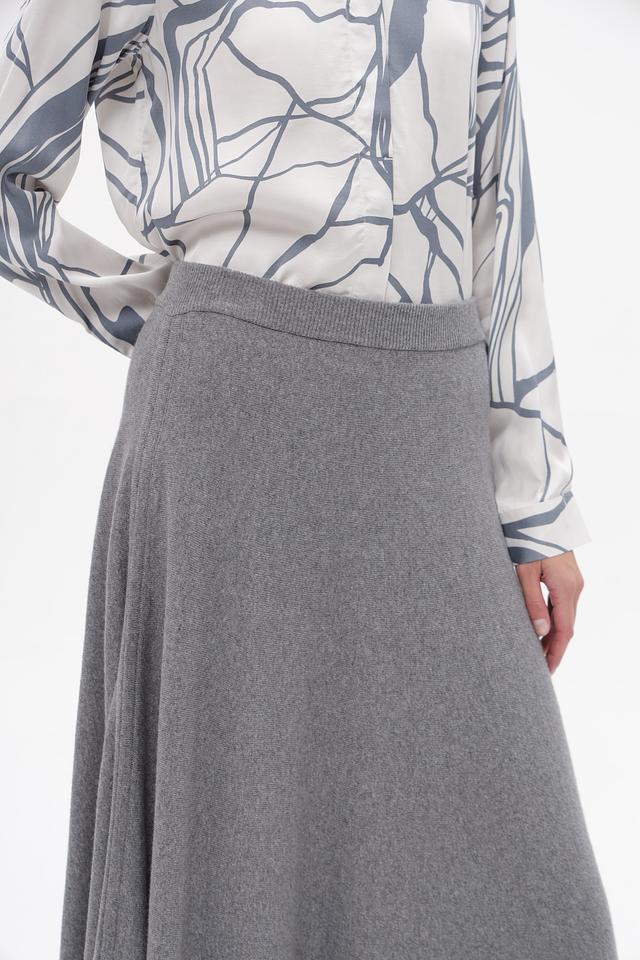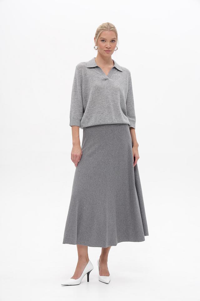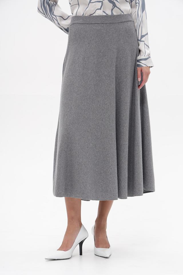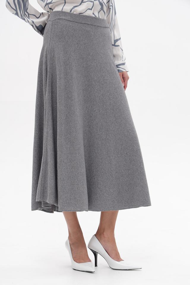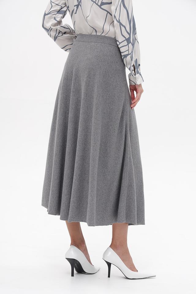 Юбка имеет лаконичный дизайн, представленный в сером цвете. Эластичный пояс обеспечивает удобную посадку по фигуре, а расклешенный силуэт добавляет образу женственности и легкости. Длина миди делает эту юбку универсальной для различных случаев.