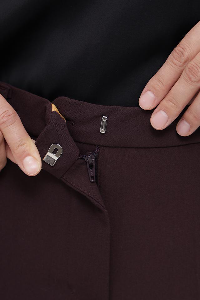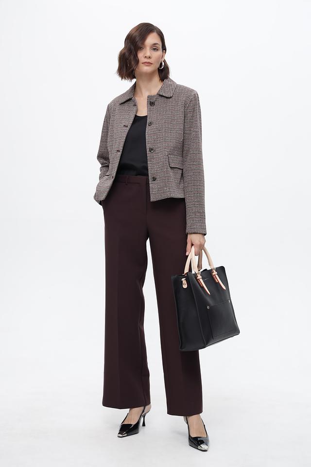 Классический крой клёш визуально вытягивает силуэт и делает образ более женственным. Брюки имеют высокую посадку, молнию и крючку в застежке. Предусмотрены боковые карманы.