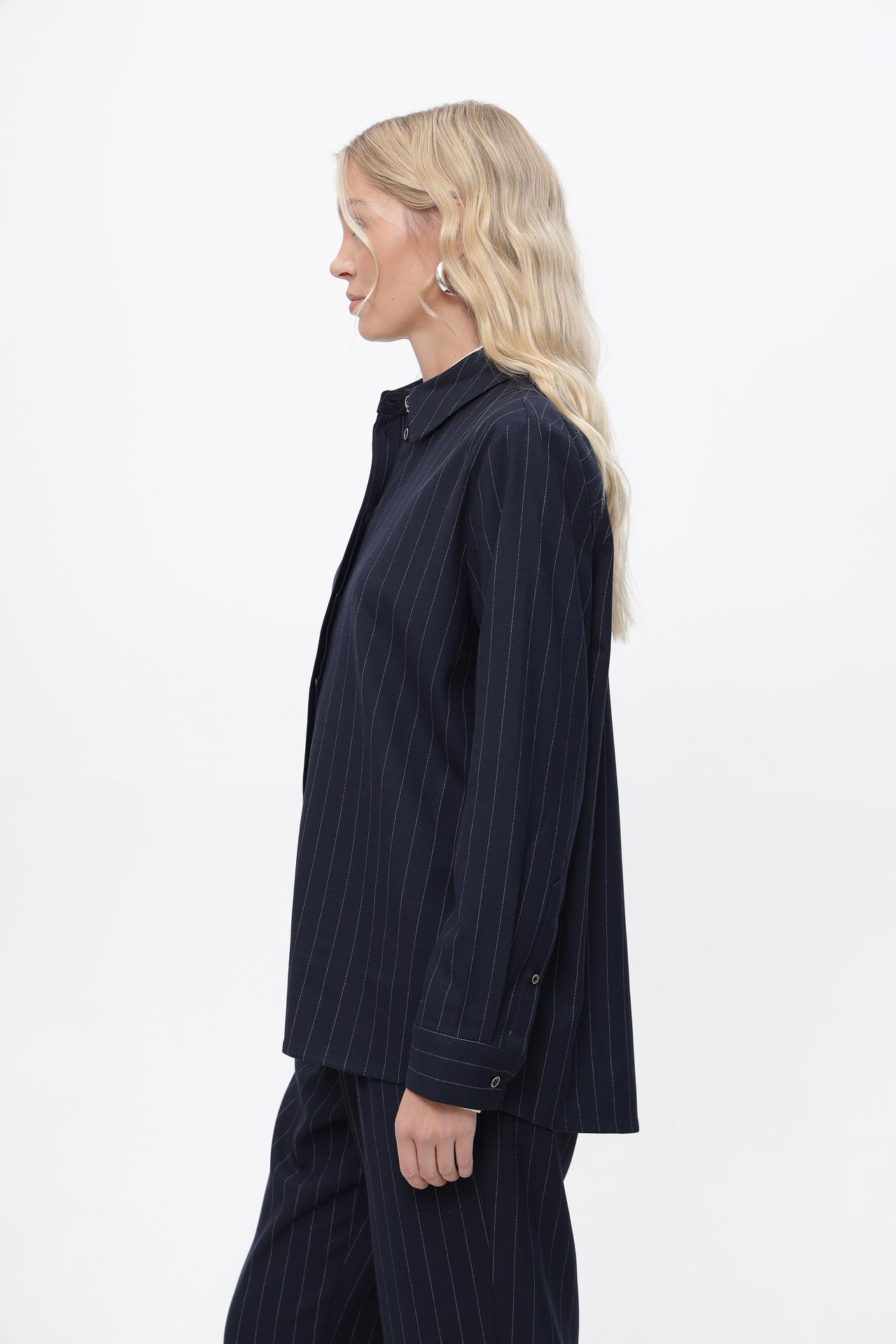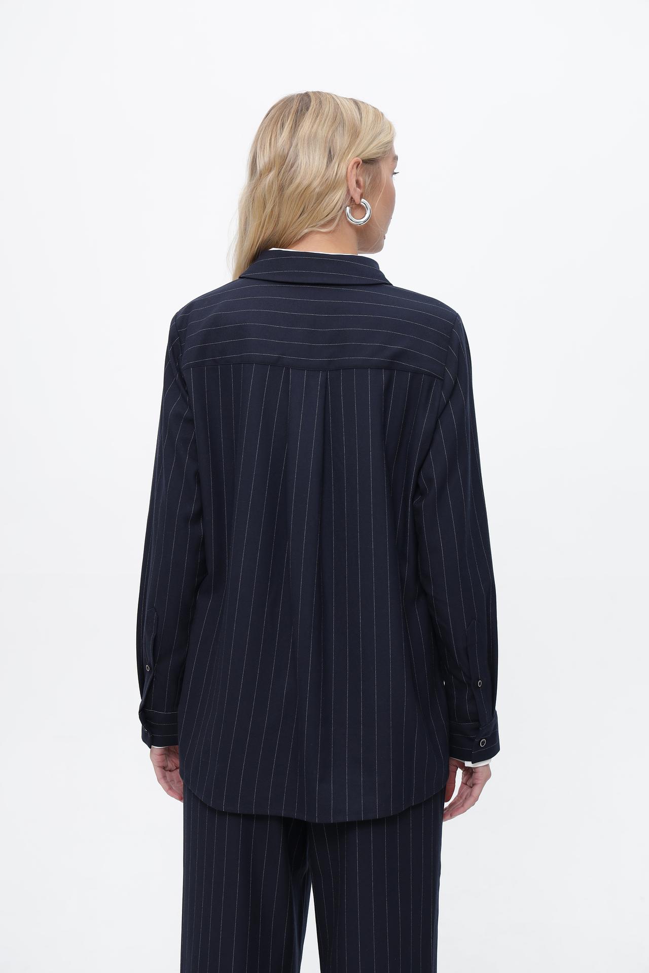 - Дизайн: Классический воротник и застежка на пуговицы создают утонченный силуэт. Вертикальная полоска визуально вытягивает фигуру.