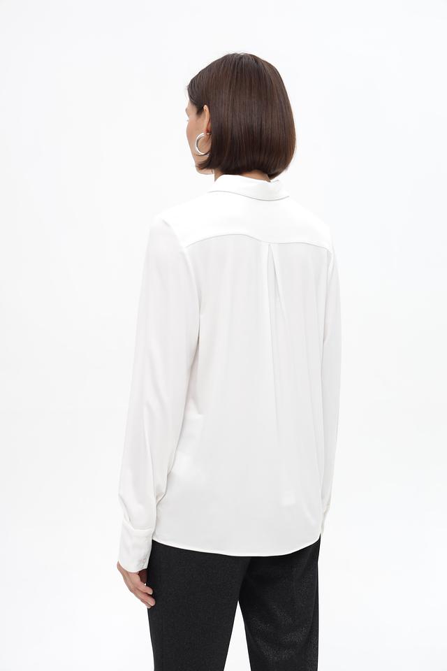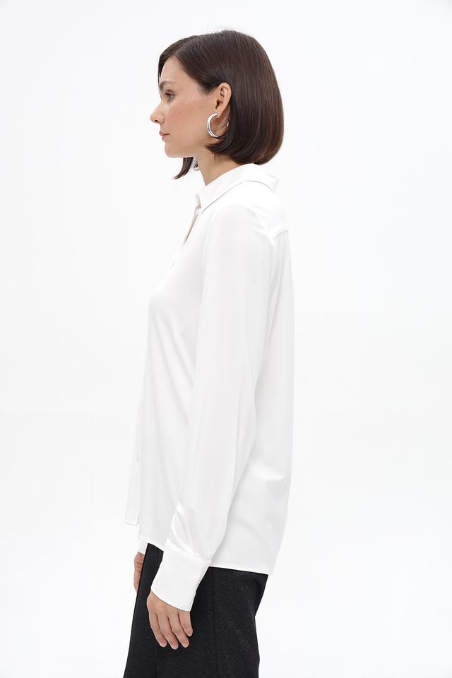 Блузка дополнена воротником классической формы и застежкой на пуговицы по всей длине. Длинные рукава заканчиваются манжетами на пуговицах, что позволяет регулировать их длину и создавать различные образы.