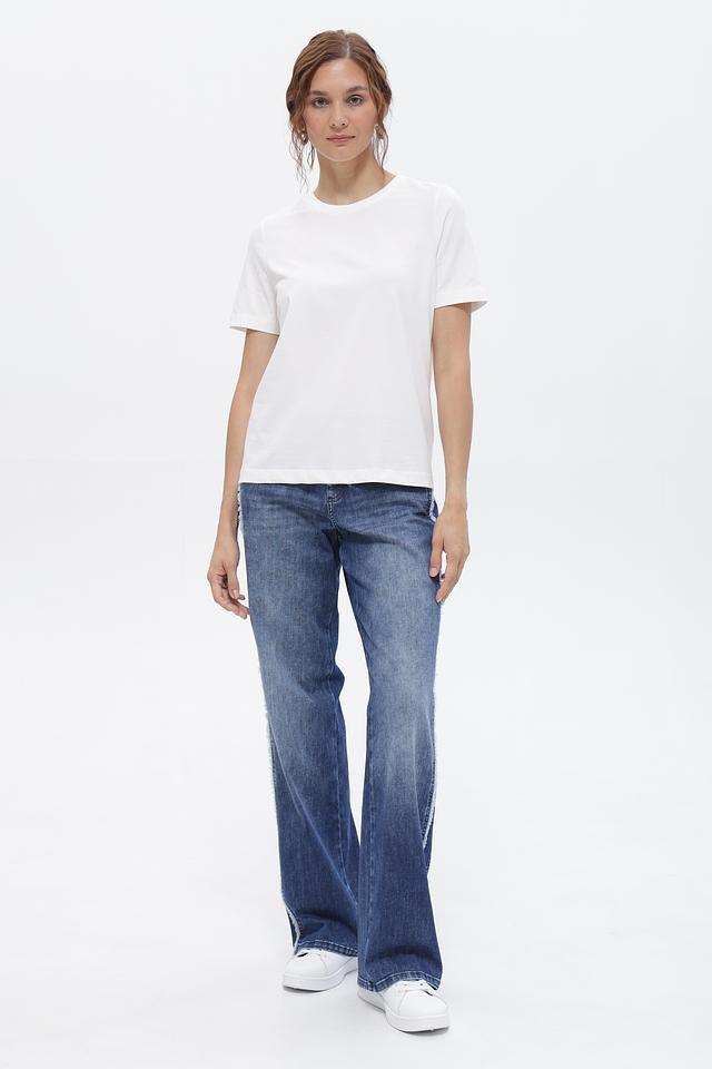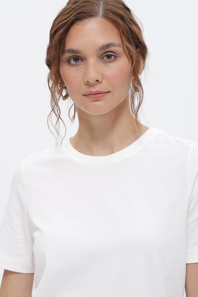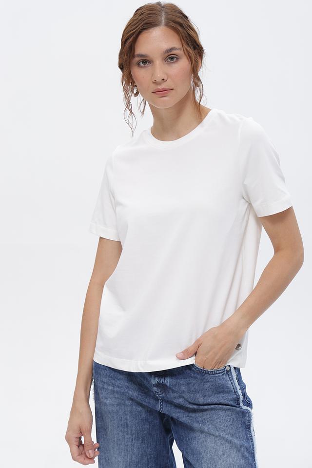Модель выполнена из качественного хлопка с небольшим добавлением эластана, что обеспечивает приятные тактильные ощущения и удобную посадку по фигуре. Классический крой футболки с круглым вырезом горловины и короткими рукавами делает её универсальной и подходящей для создания различных образов.