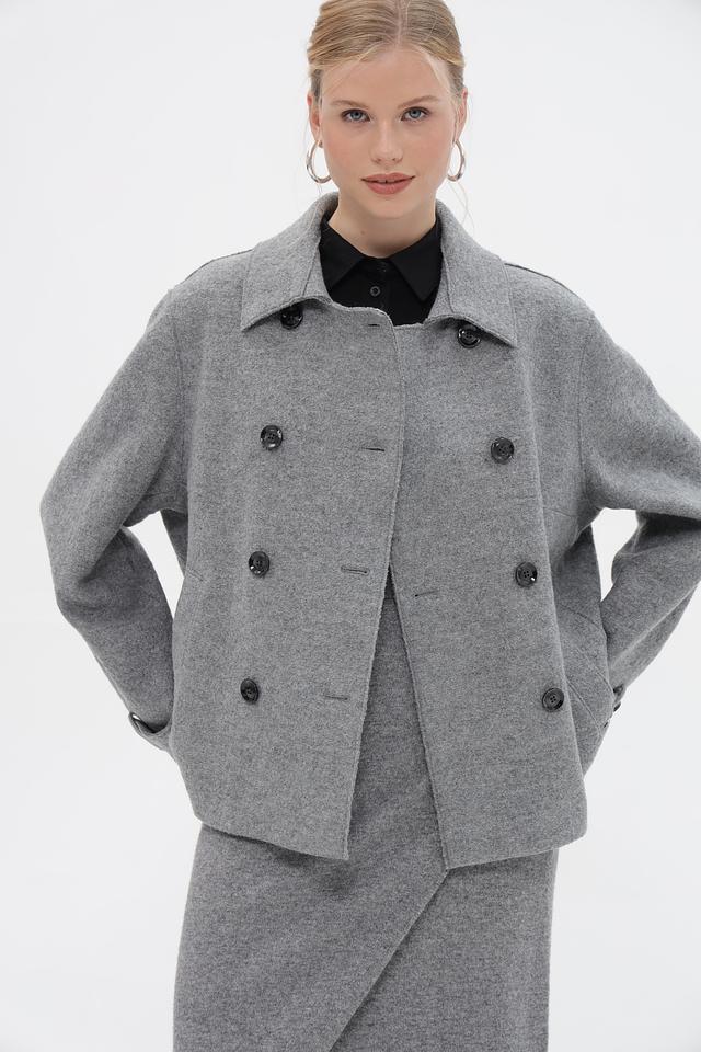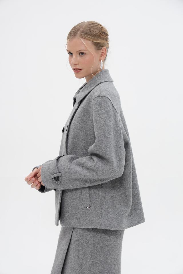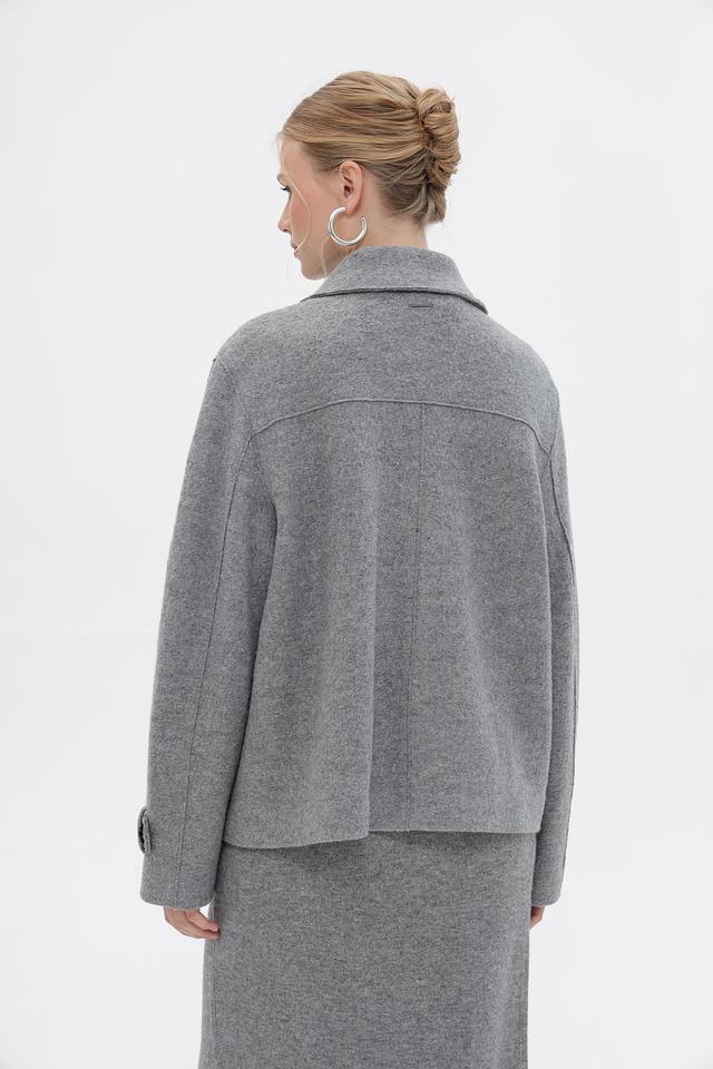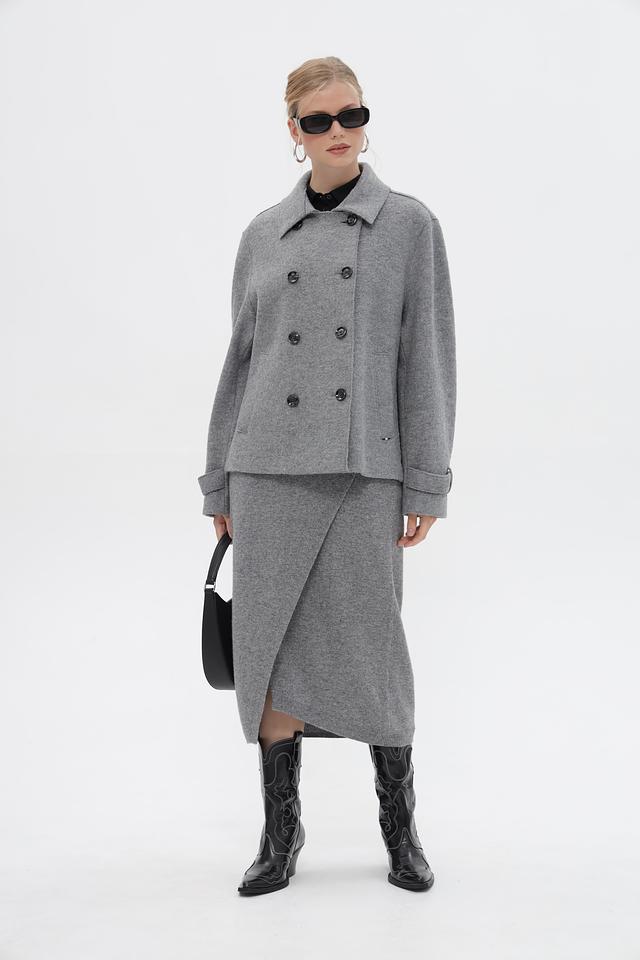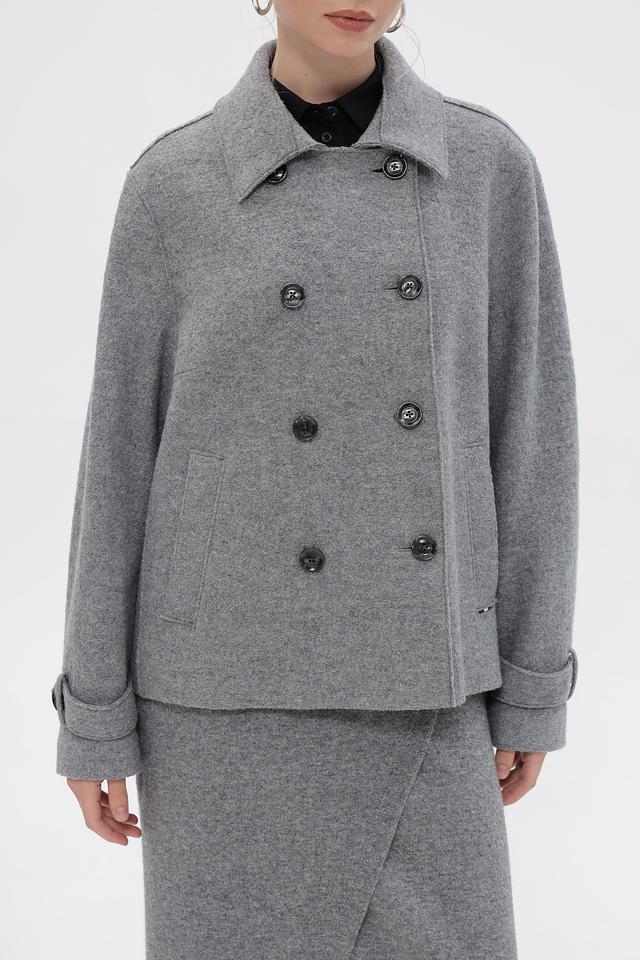 Женская куртка Bugatti серого цвета с двубортной застежкой и широким воротником. Модель выполнена из мягкого материала с добавлением шерсти и вискозы, что обеспечивает комфорт и тепло. Состав: шерсть 50%, вискоза 50%
