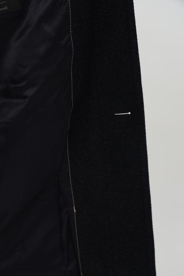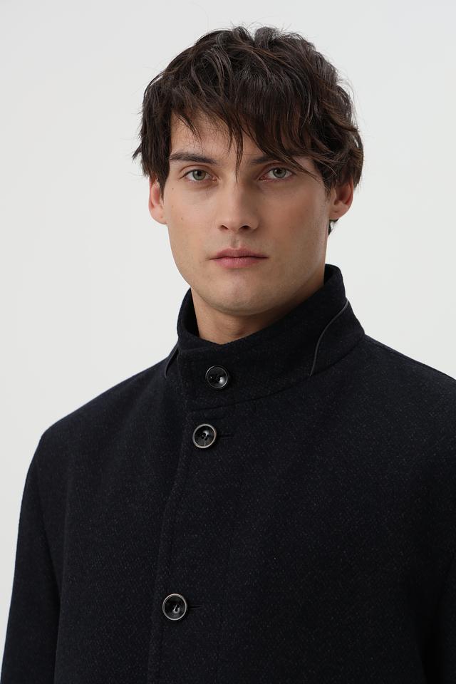 Модель имеет воротник-стойку и два боковых кармана. Подкладка выполнена из тонкой ткани в чёрно-сером принте. Состав ткани: 20% шерсть, 55% полиакрил, 25% полиэстер.