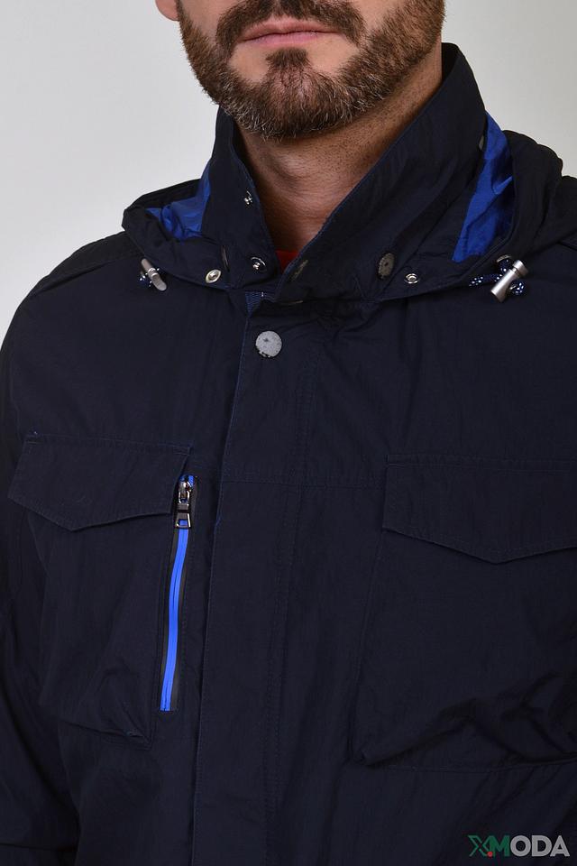 Куртка имеет классический крой, который подходит для большинства типов фигуры. Тёмно-синий цвет делает её универсальной и легко сочетаемой с различными элементами гардероба. Капюшон добавляет функциональности, а молнии и карманы обеспечивают удобство использования.