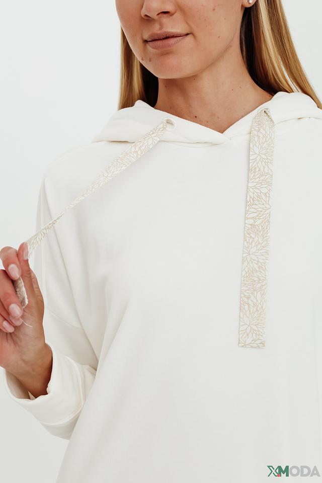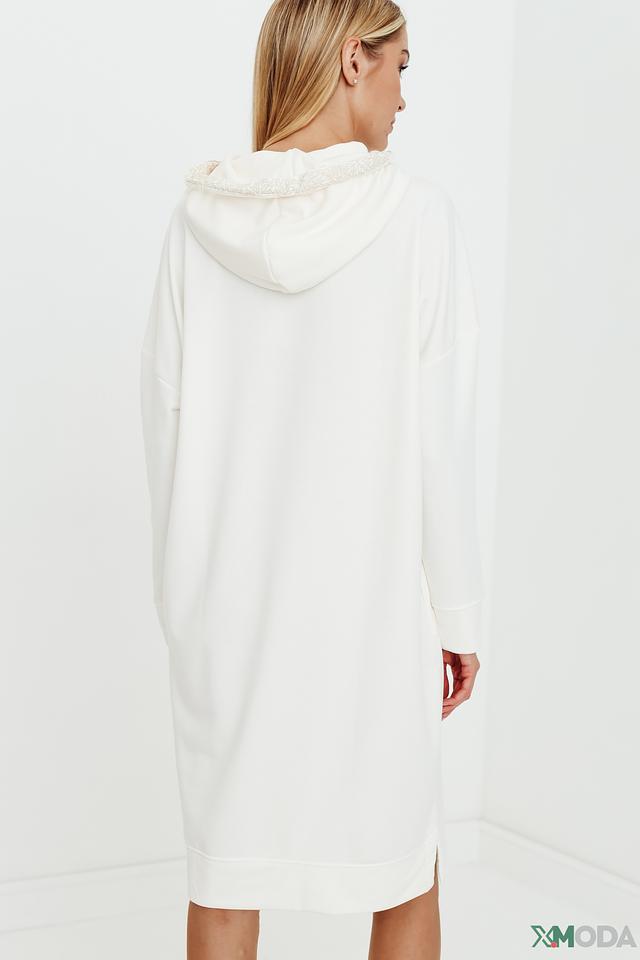 Платье имеет прямой, слегка завышенный силуэт, который обеспечивает свободу движений и комфорт в носке. Особенностью модели является капюшон со шнурками, декорированными вышивкой в тон изделия.