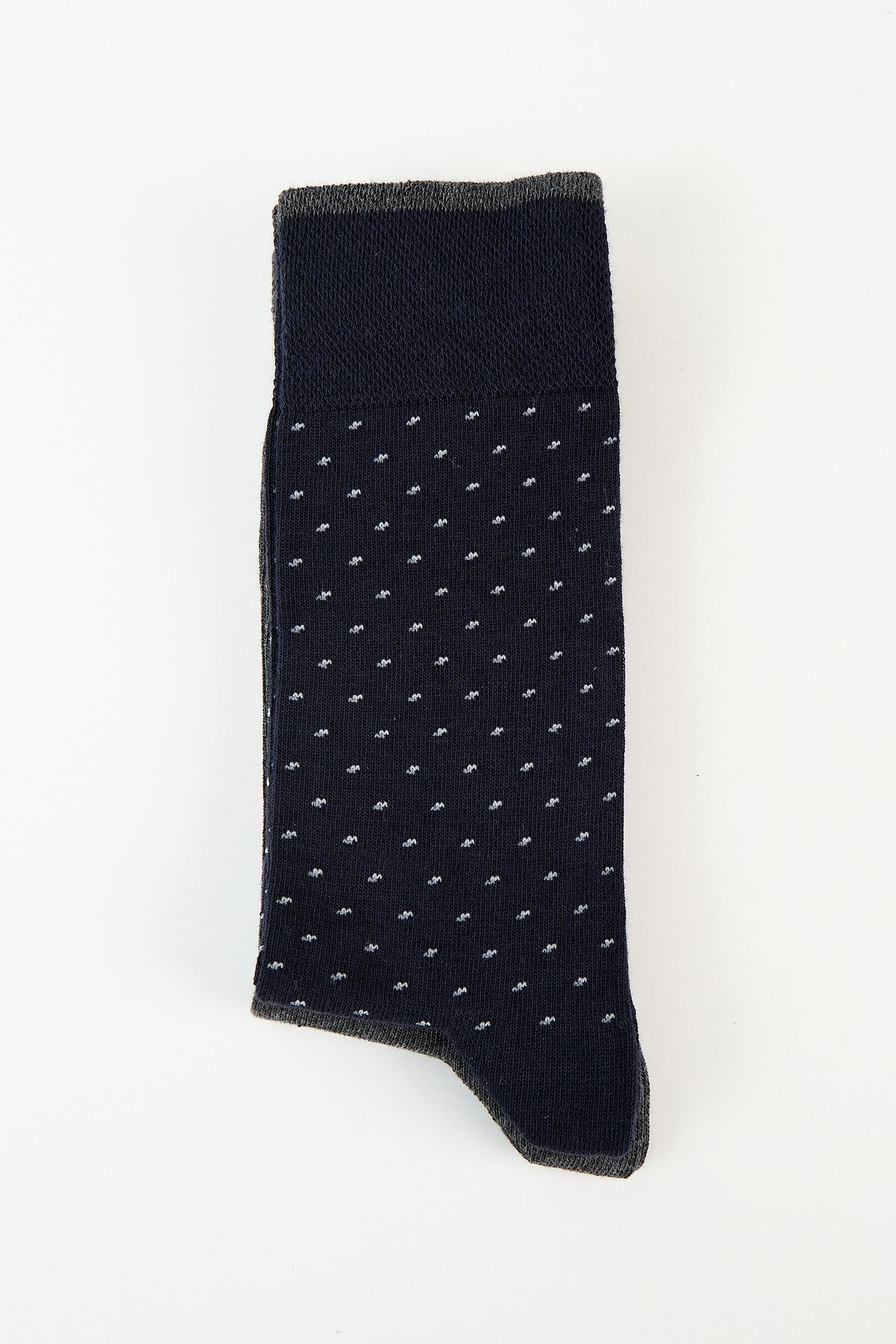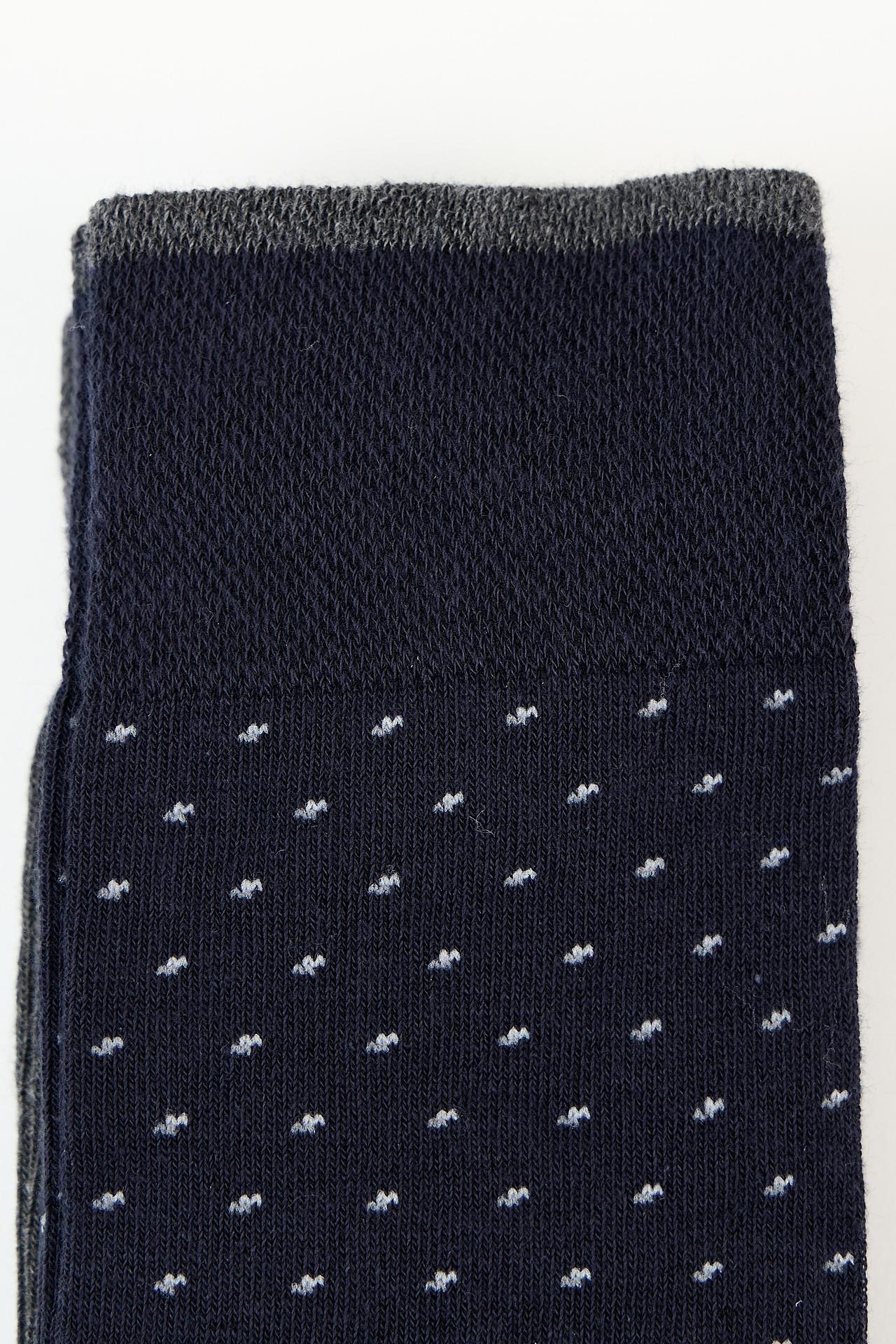 - Дизайн: Элегантный темно-синий цвет с деликатным белым узором в мелкий горошек. Серые резинка и пятка создают стильный контраст и подчеркивают классический вид изделия.