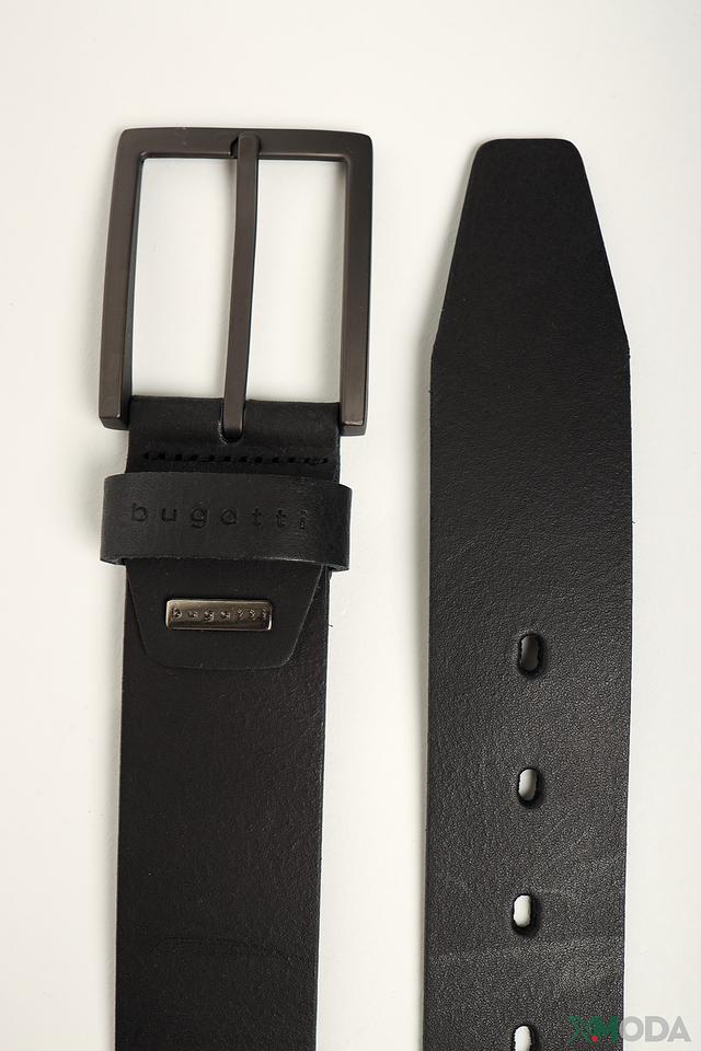 Ремень оснащён классической пряжкой серого цвета, которая гармонично сочетается с кожей. Пряжка надёжно фиксирует ремень, обеспечивая комфортную посадку. На ремне имеется тиснение с логотипом бренда Bugatti, что подчеркивает его премиальный статус.
