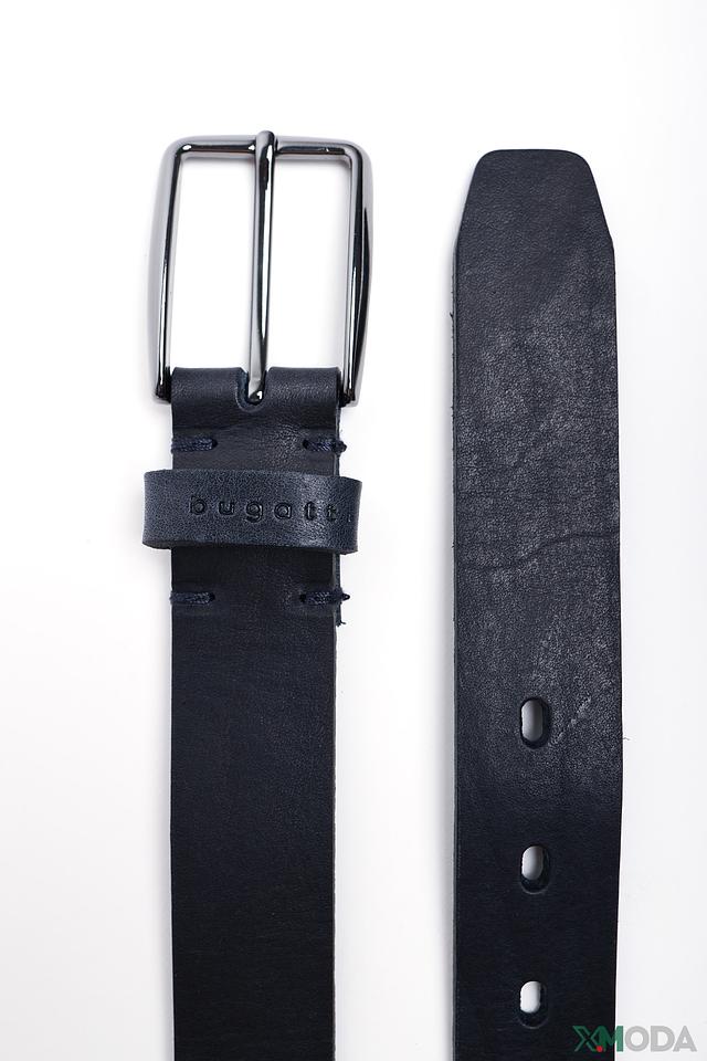 Пряжка ремня выполнена из металла серебристого цвета, имеет прямоугольную форму и лаконичный дизайн. На ремне присутствует тиснение с логотипом бренда Bugatti, что подчеркивает его принадлежность к премиальному сегменту.