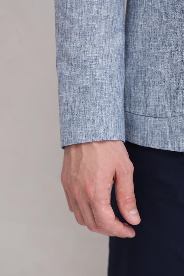 Пиджак имеет классический крой, который подходит для большинства типов фигур. Голубой цвет с текстурой льна придаёт изделию свежий и современный вид. Застёжка на две пуговицы, аккуратный лацкан и функциональные карманы делают этот пиджак практичным и универсальным.