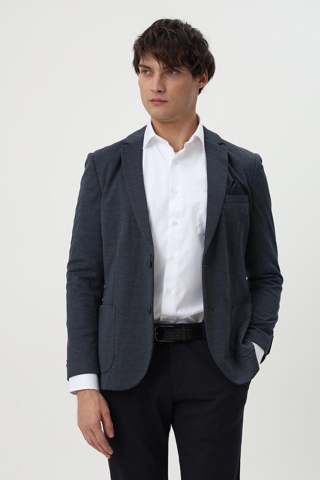 Мужской пиджак Calamar синего цвета с мелким клетчатым рисунком. Модель выполнена из смесового материала с добавлением полиэстера и вискозы, обеспечивающего комфорт и практичность. Состав: полиэстер 73%, вискоза 26%, эластан 1%