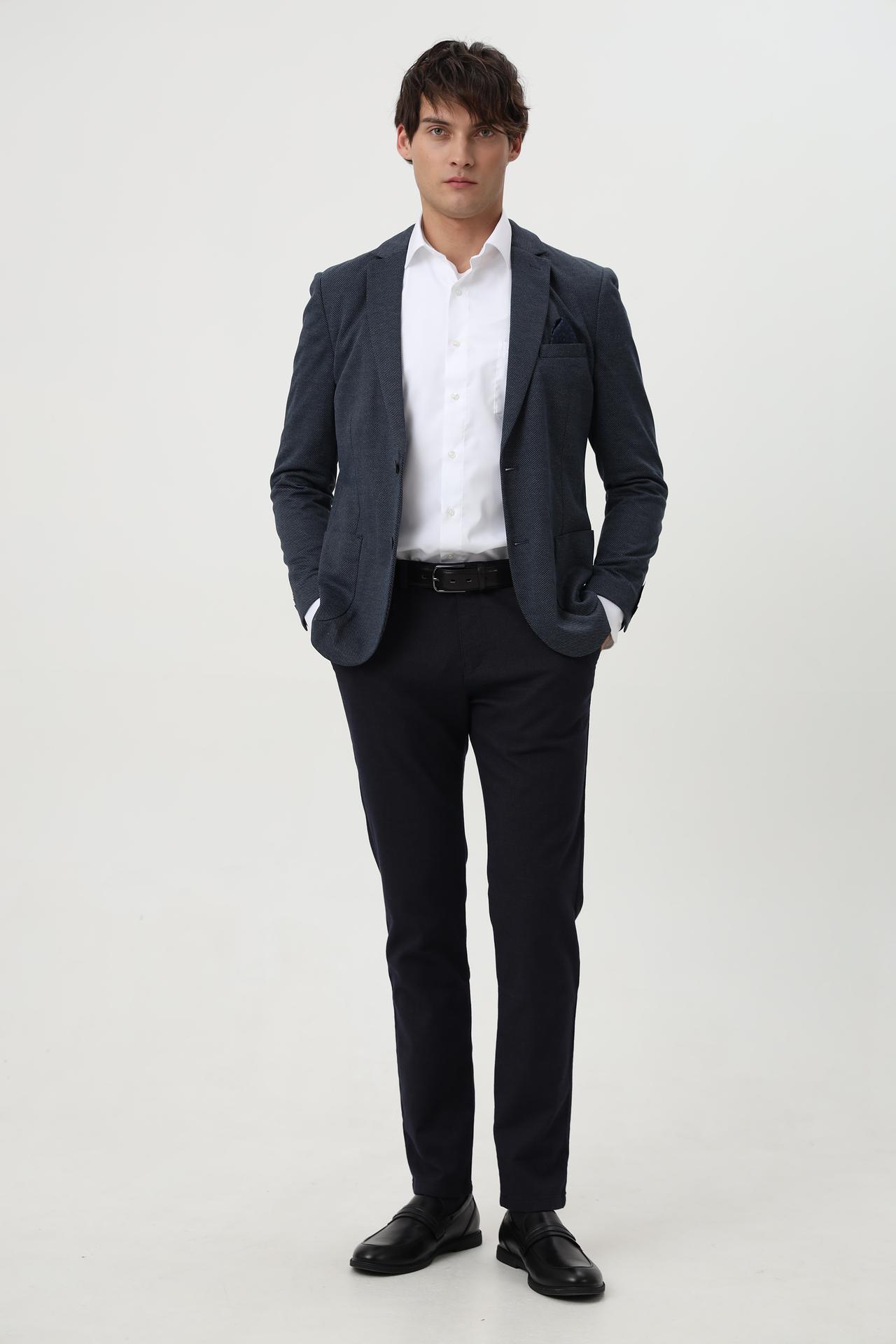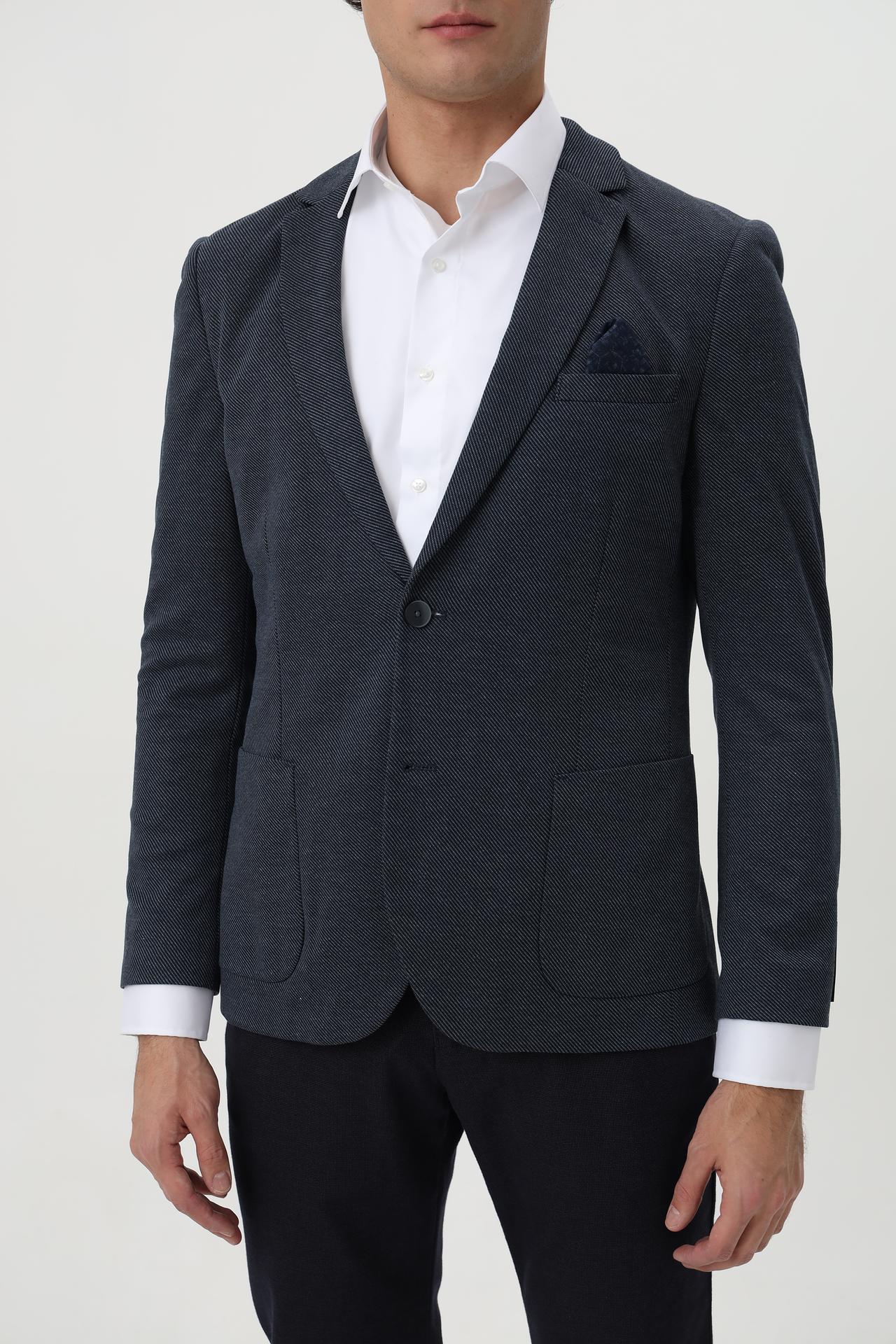 - Детали: Пиджак имеет два накладных кармана спереди и один нагрудный карман, декорированный платком-паше в тон. Центральная застежка на две пуговицы.