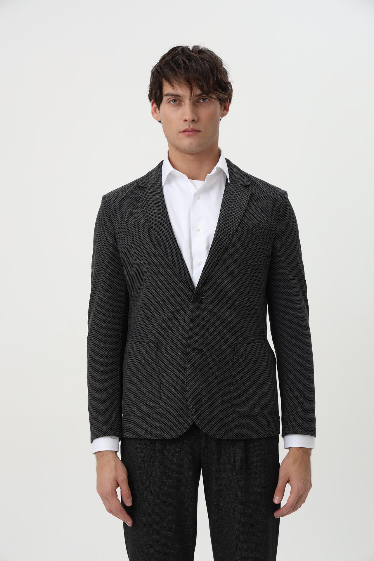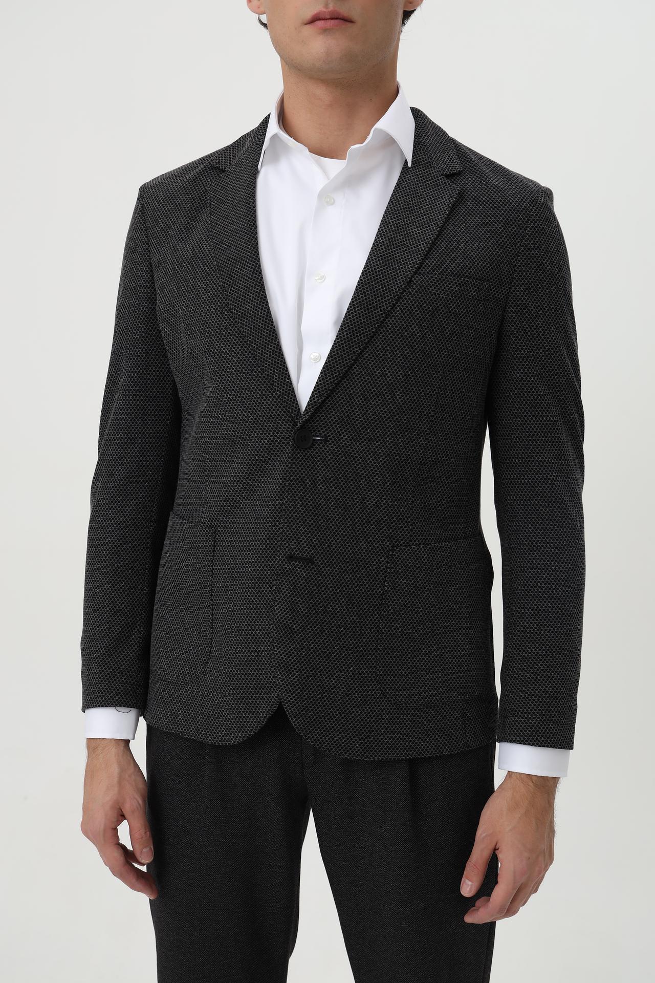 - Дизайн и крой: Классический крой пиджака с двумя пуговицами и элегантными лацканами создает строгий, но в то же время современный силуэт. Он идеально садится по фигуре, подчеркивая достоинства мужской фигуры.