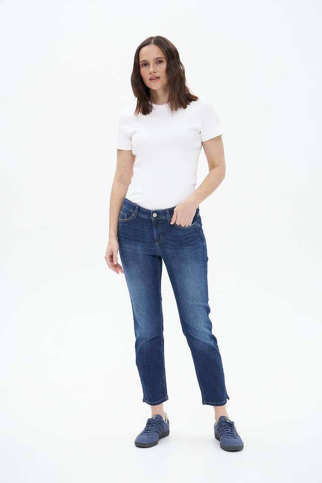 Женские джинсы Cambio классического синего цвета с эффектом утяжки. Модель выполнена из хлопка с добавлением эластана для комфортной посадки и сохранения формы. Идеальный выбор для повседневного образа. Состав: хлопок 92%, эластомультиэстер 6%, эластан 2%