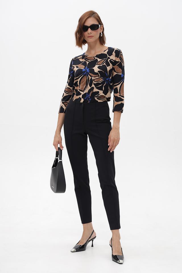 Брюки имеют зауженный силуэт, который визуально стройнит фигуру и подчеркивает ее достоинства. Высокая посадка обеспечивает комфортную посадку и позволяет создавать различные образы, от деловых до повседневных.