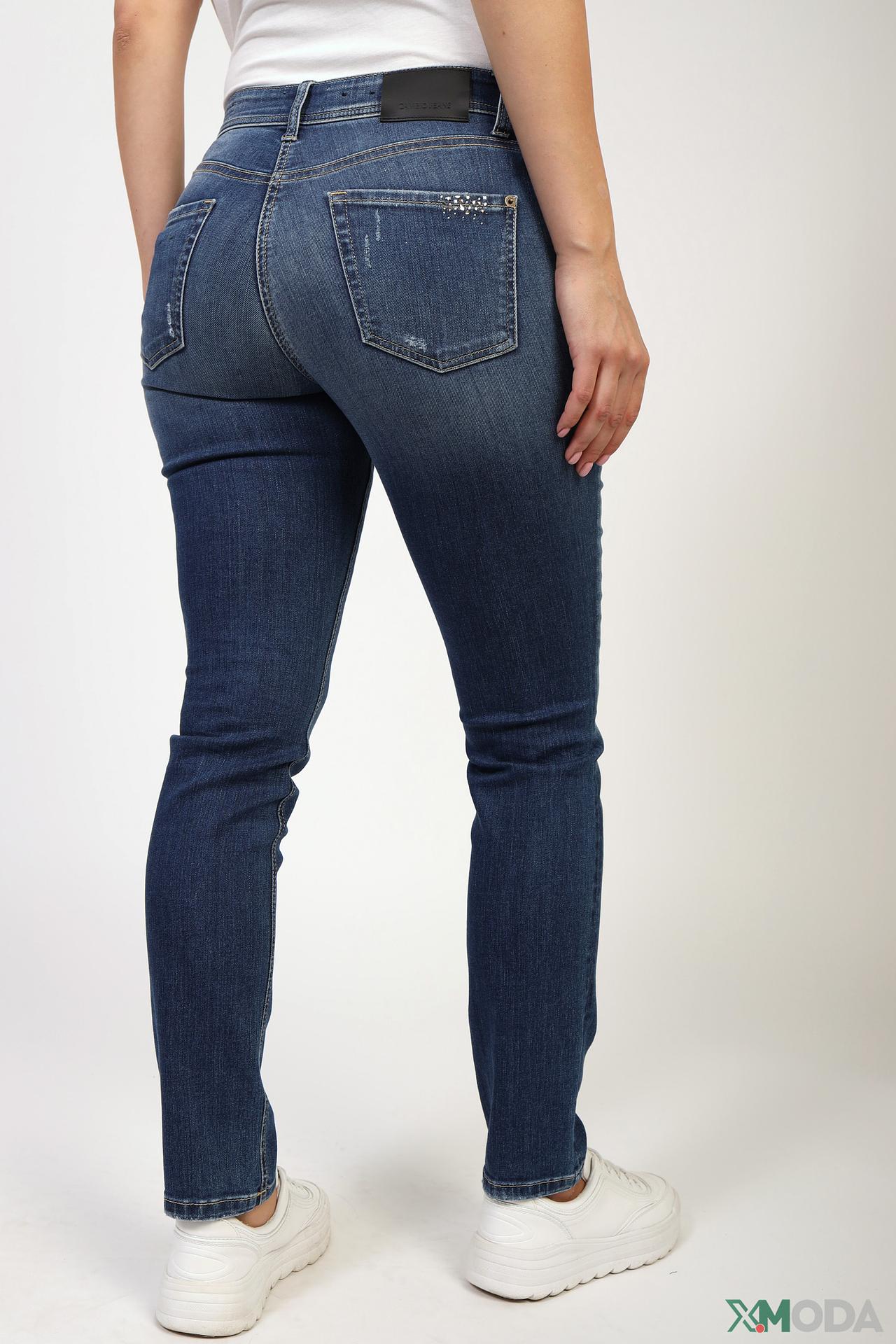 - Изысканные детали: Классический синий деним дополнен легкими потертостями и деликатным декором из сияющих страз на заднем кармане, придающим изделию особый шарм и индивидуальность.