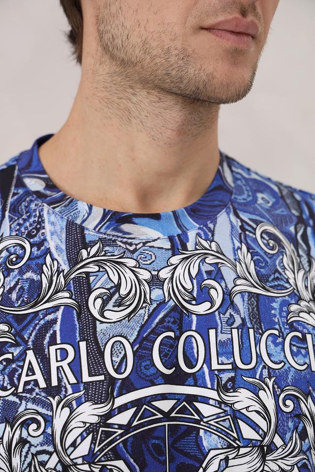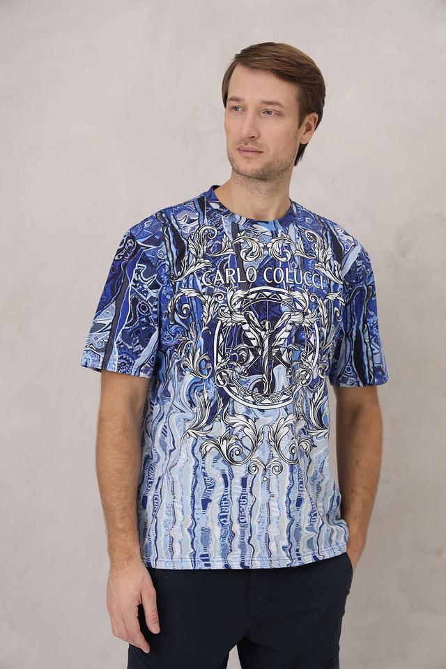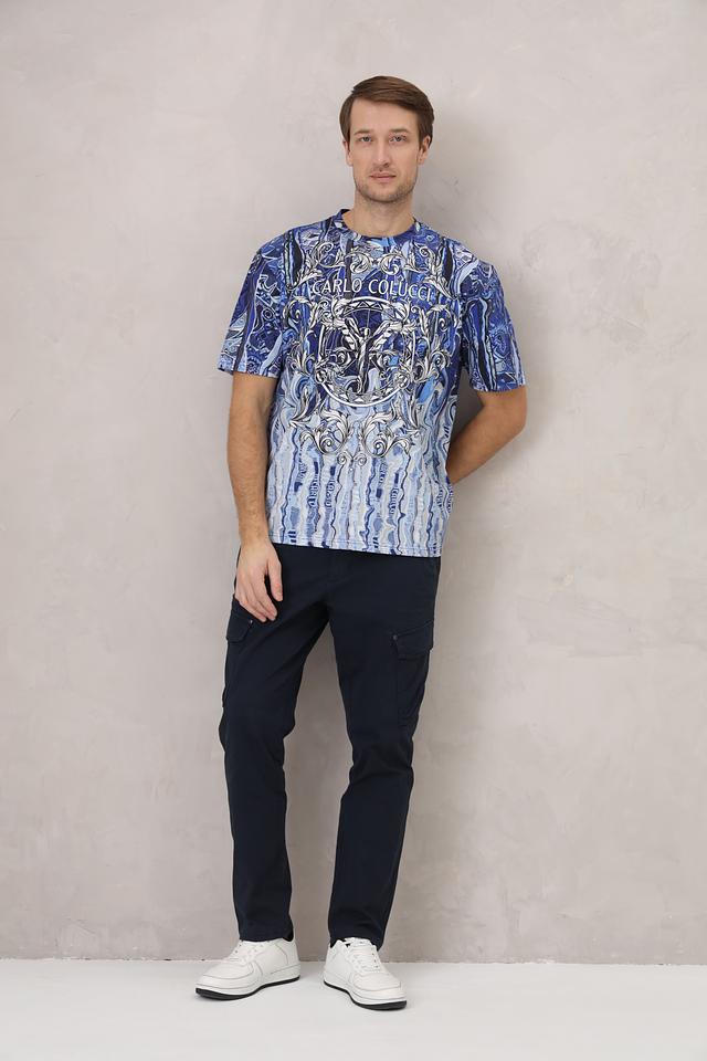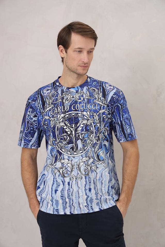 Мужская футболка Carlo Colucci синего цвета с ярким геометрическим принтом и логотипом бренда. Изготовлена из 100% хлопка, обеспечивающего комфорт и воздухопроницаемость. Состав: хлопок 100%