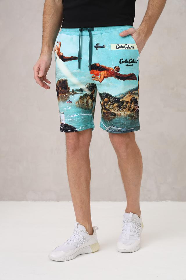 Мужские шорты Carlo Colucci бирюзового цвета с ярким принтом в виде пейзажа и летательных аппаратов. Модель выполнена из мягкого хлопка и оснащена удобным шнурком на поясе. Состав: хлопок 100%