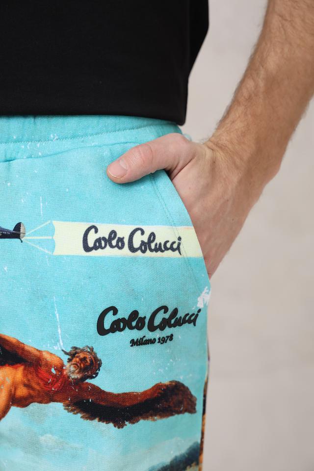 Представляем стильные мужские шорты от бренда Carlo Colucci. Эта модель выполнена в ярком бирюзовом цвете и украшена оригинальным принтом, изображающим морской пейзаж с элементами ретро-авиации.