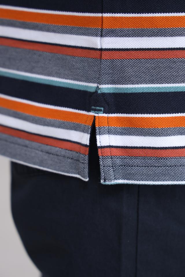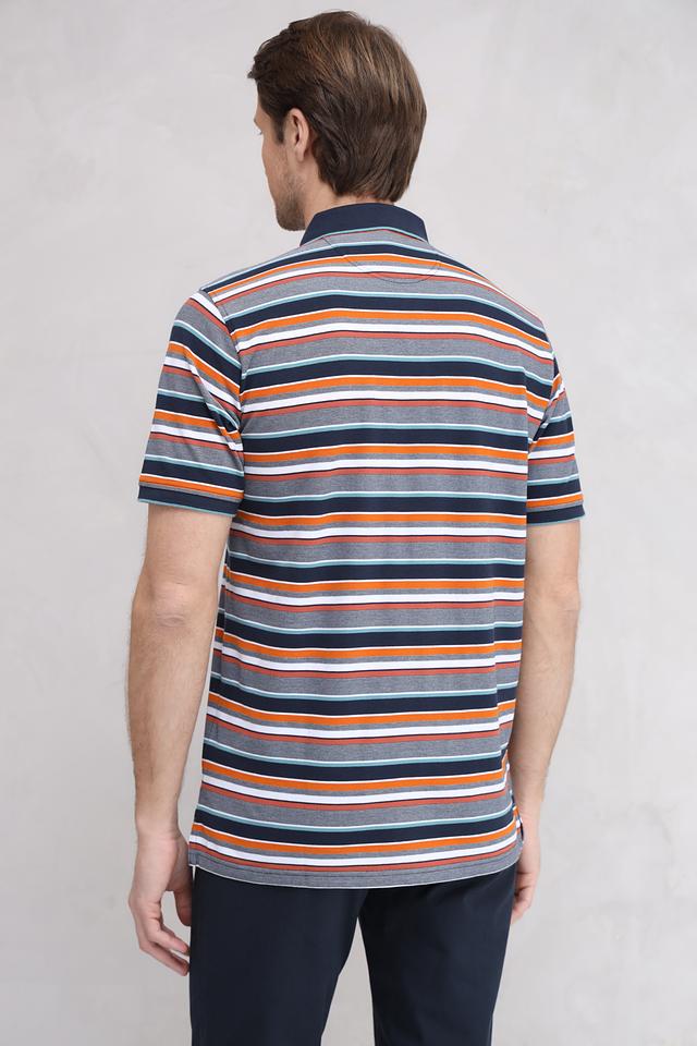 Модель выполнена в яркой полосатой расцветке, сочетающей в себе оттенки синего, оранжевого, серого и белого. Классический крой с коротким рукавом и воротником-поло делает эту рубашку универсальной для различных ситуаций. Наличие нагрудного кармана добавляет функциональности и акцентирует внимание на деталях.