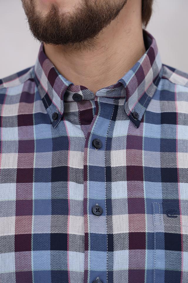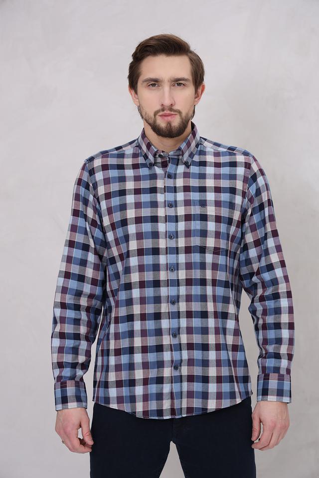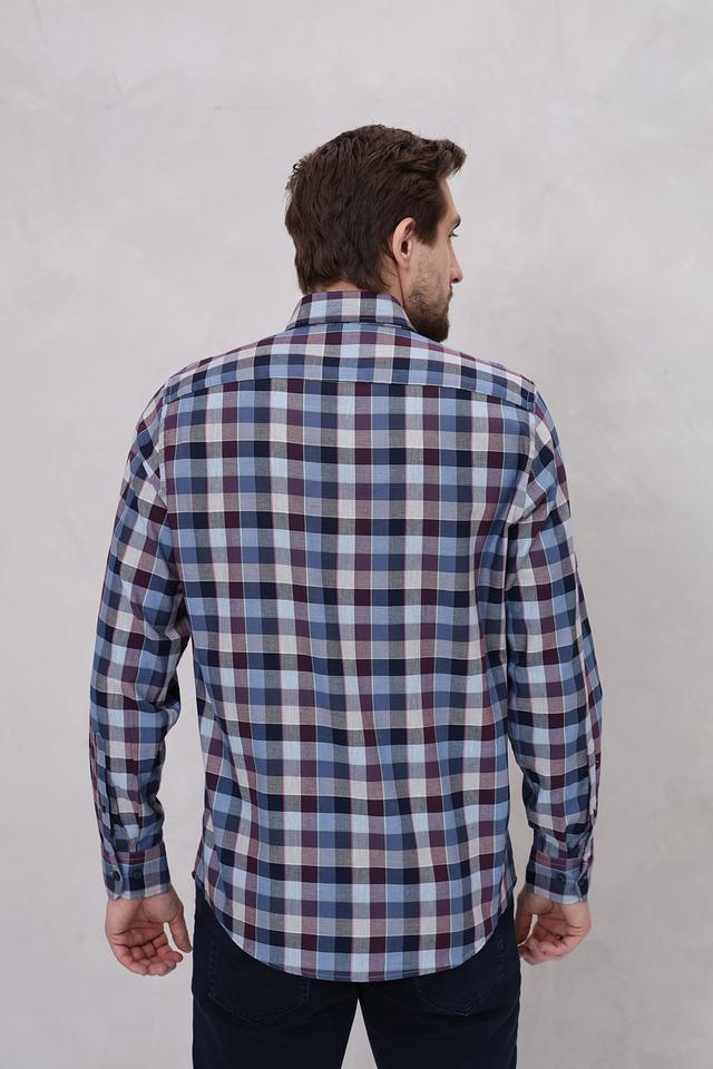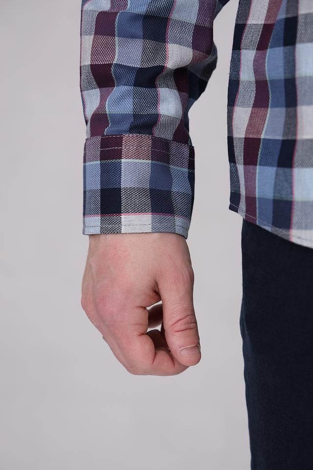 Рубашка имеет классический крой с длинными рукавами и традиционным воротником. Особенностью модели является стильная клетка, выполненная в сочетании синих, бордовых и серых оттенков. Такой рисунок делает рубашку универсальной и легко сочетаемой с различными элементами одежды.