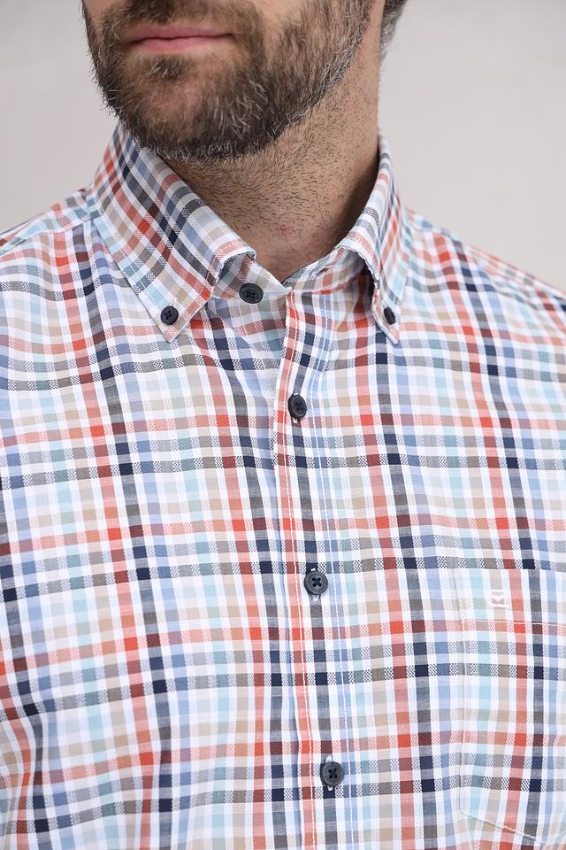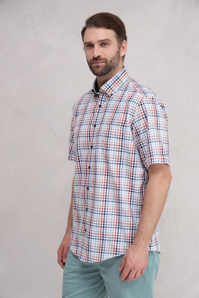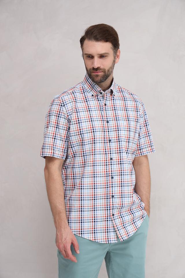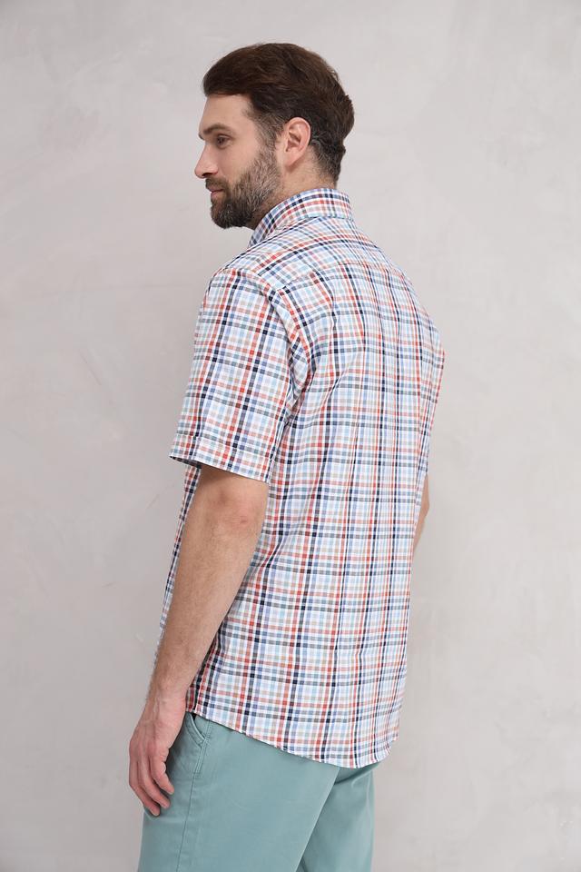 Рубашка имеет классический крой с короткими рукавами и воротником на пуговицах. Особенностью модели является яркий клетчатый принт, сочетающий в себе оттенки голубого, оранжевого и коричневого. Такой рисунок придаёт рубашке свежий и динамичный вид.