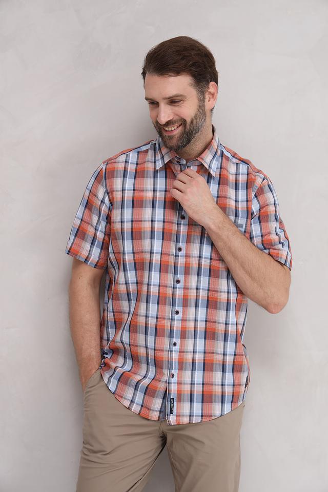 Особенностью данной модели является яркий клетчатый принт в оранжево-голубой гамме. Рубашка имеет классический воротник, застёжку на пуговицы и нагрудный карман. Она прекрасно сочетается с брюками чинос, джинсами или шортами, создавая непринуждённый и стильный образ.