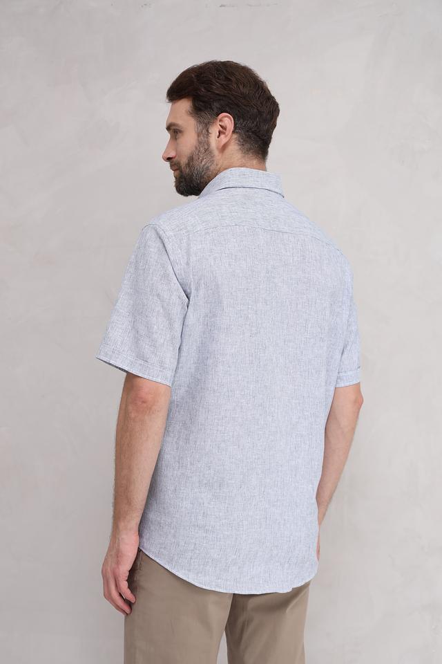 Рубашка имеет классический крой с коротким рукавом и стандартным воротником. Текстура ткани с лёгкой полоской придает ей стильный и непринужденный вид. Застежка на пуговицы по всей длине обеспечивает удобство ношения.