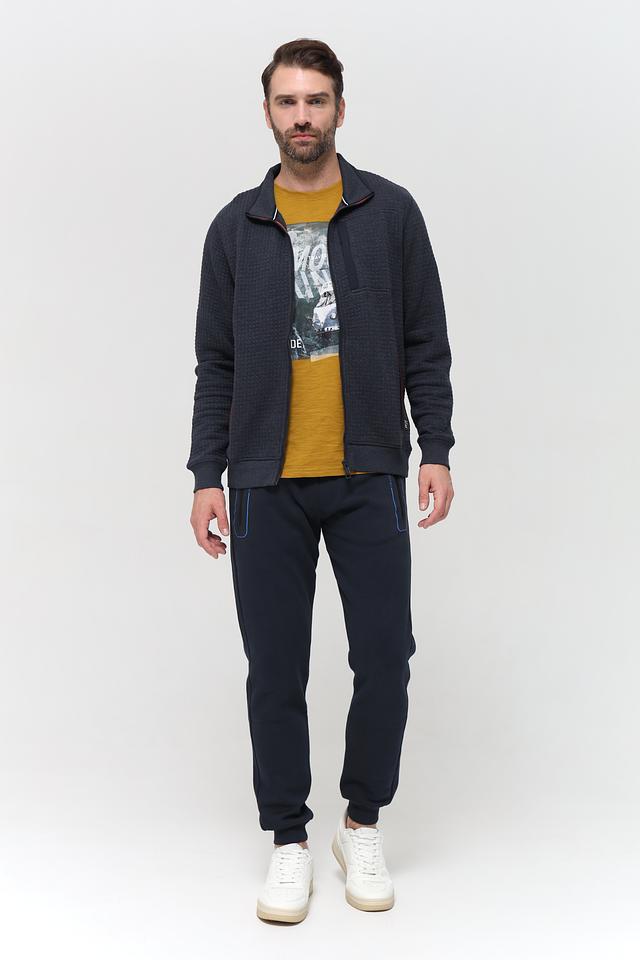 Мужской кардиган Casa Moda темно-синего цвета с фактурной стеганой поверхностью. Изготовлен из сочетания полиэстера, хлопка и эластана, обеспечивающего комфорт и удобство в носке. Состав: полиэстер 57%, хлопок 40%, эластан 3%
