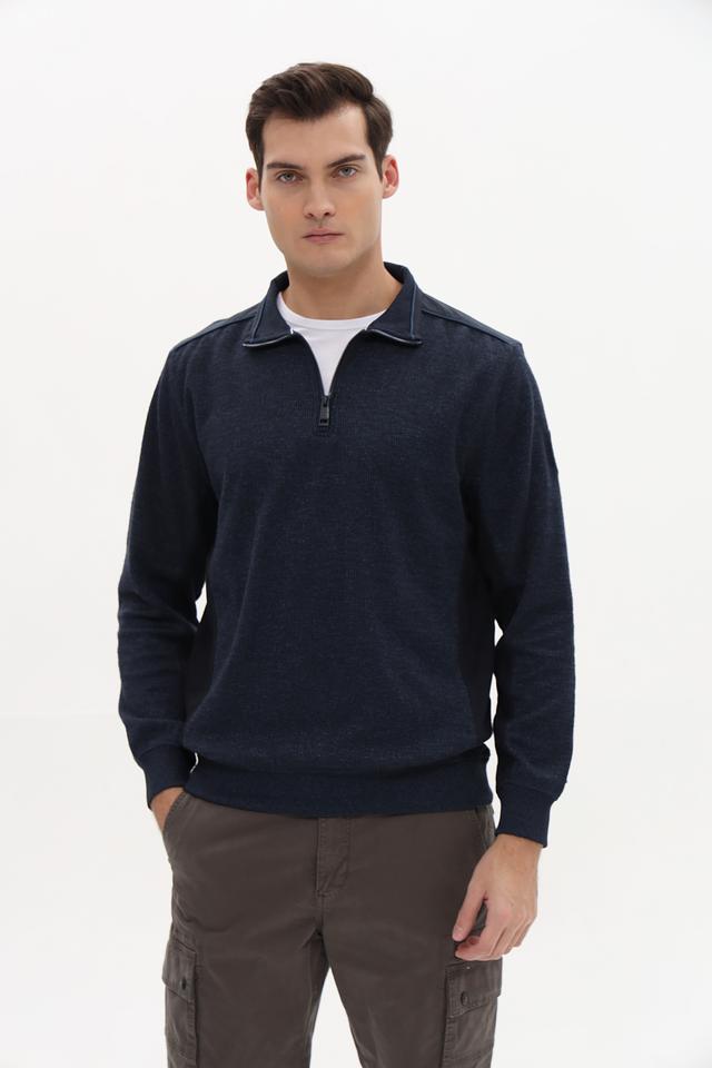 Мужской джемпер Casa Moda темно-синего цвета с воротником-стойкой и короткой молнией. Изготовлен из мягкого и приятного к телу сочетания хлопка и полиэстера, обеспечивающего комфорт и практичность. Состав: хлопок 70%, полиэстер 30%