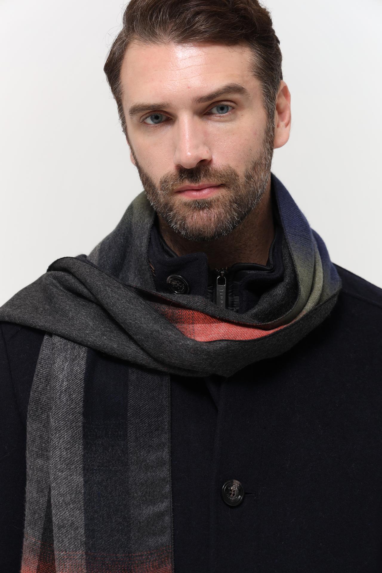 - Цветовая гамма: Шарф представлен в разнообразной цветовой палитре, включающей оттенки серого, оранжевого, хаки и синего. Такая комбинация позволяет легко сочетать его с различными предметами гардероба.