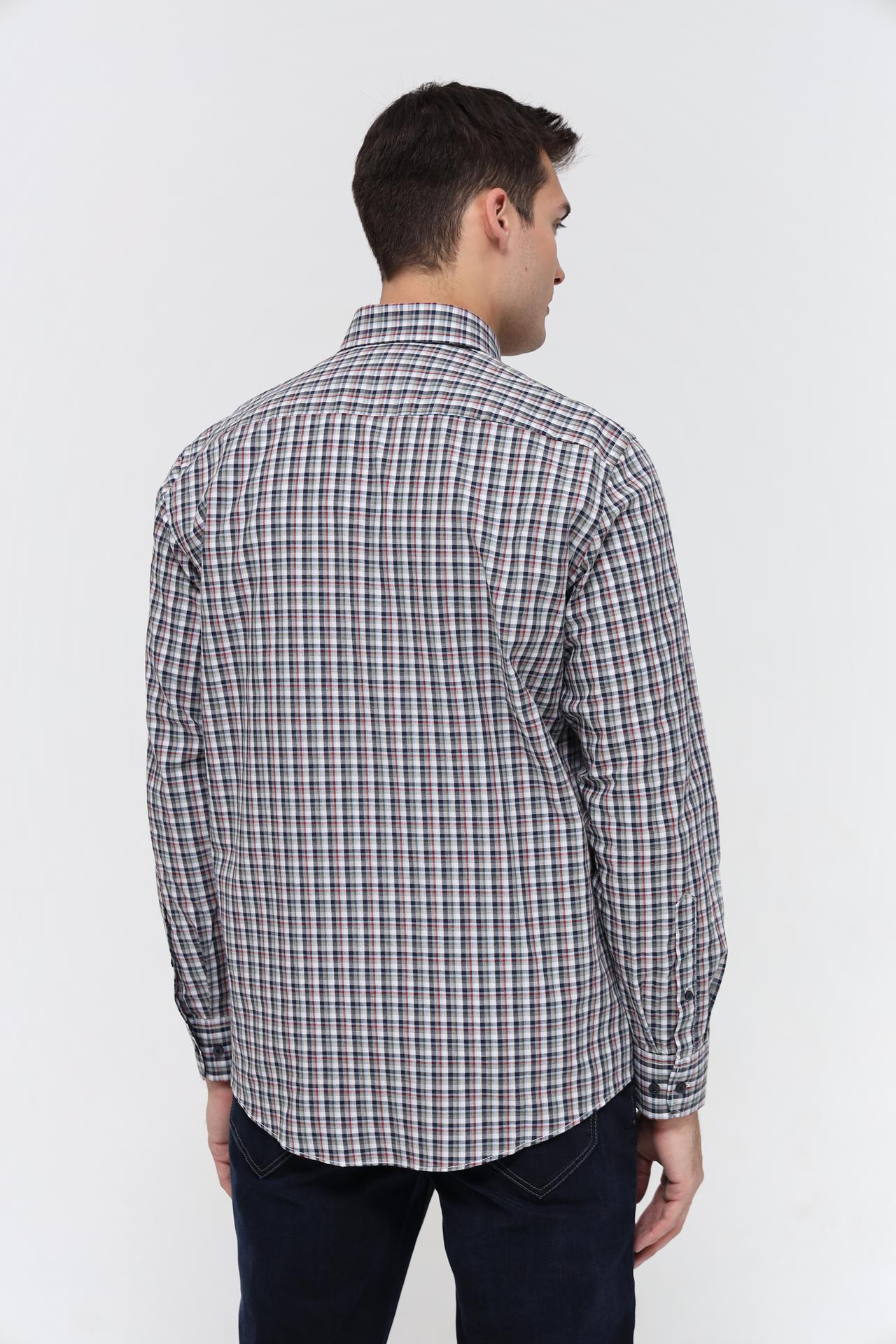- Дизайн: Рубашка имеет классический крой и воротник на пуговицах, что подчеркивает ее универсальность. Принт в мелкую клетку (синий, зеленый, красный, белый) делает модель актуальной и стильной.