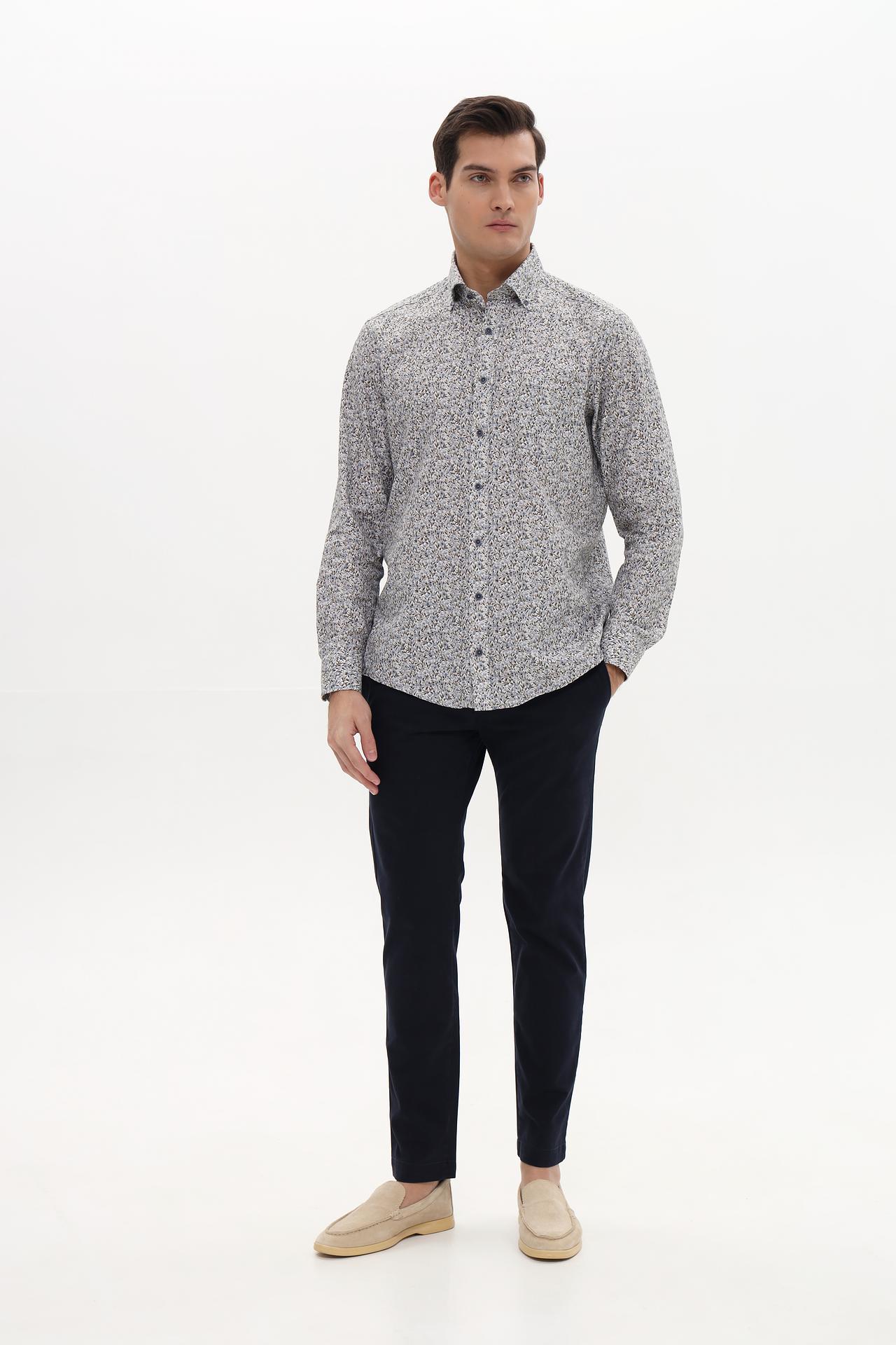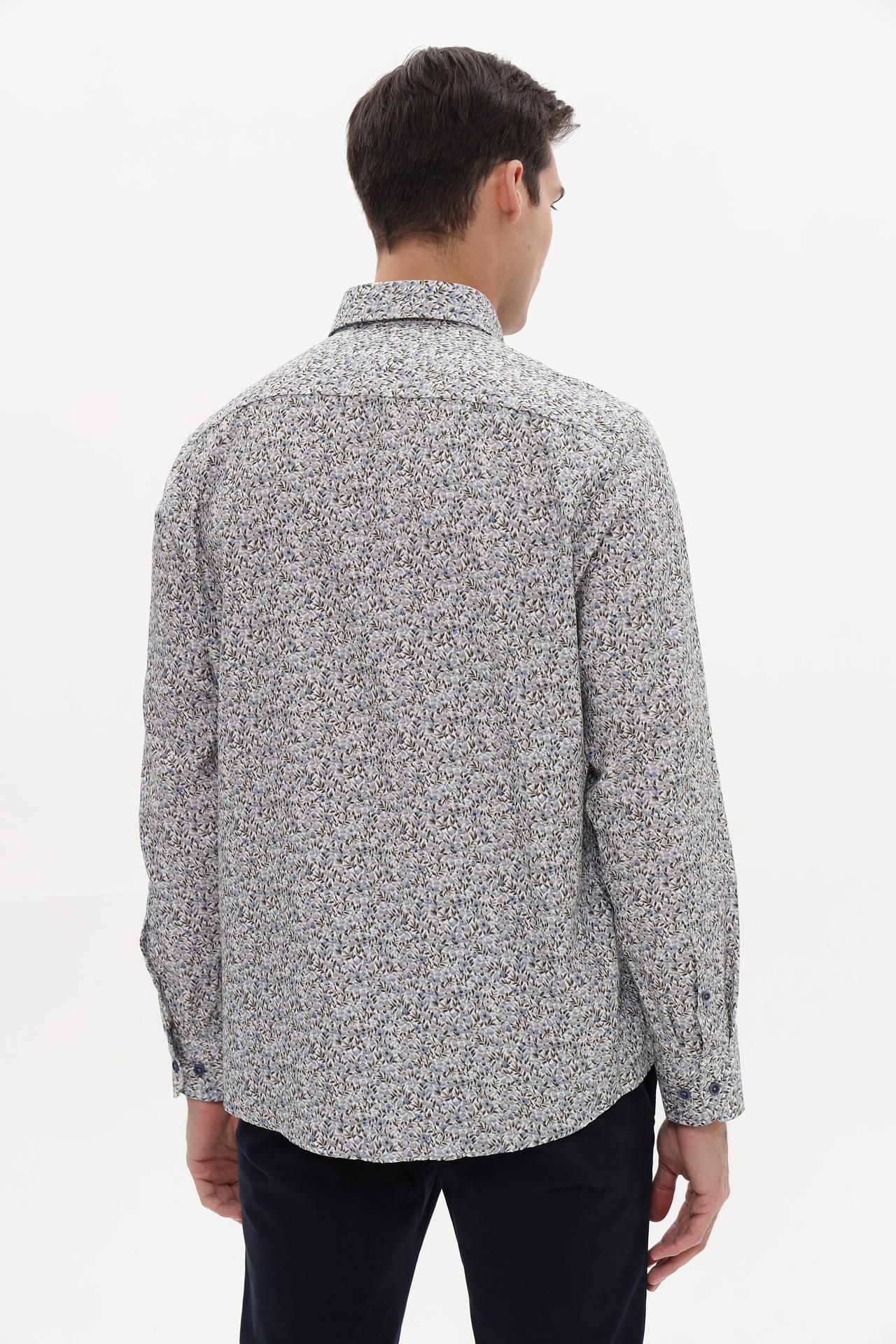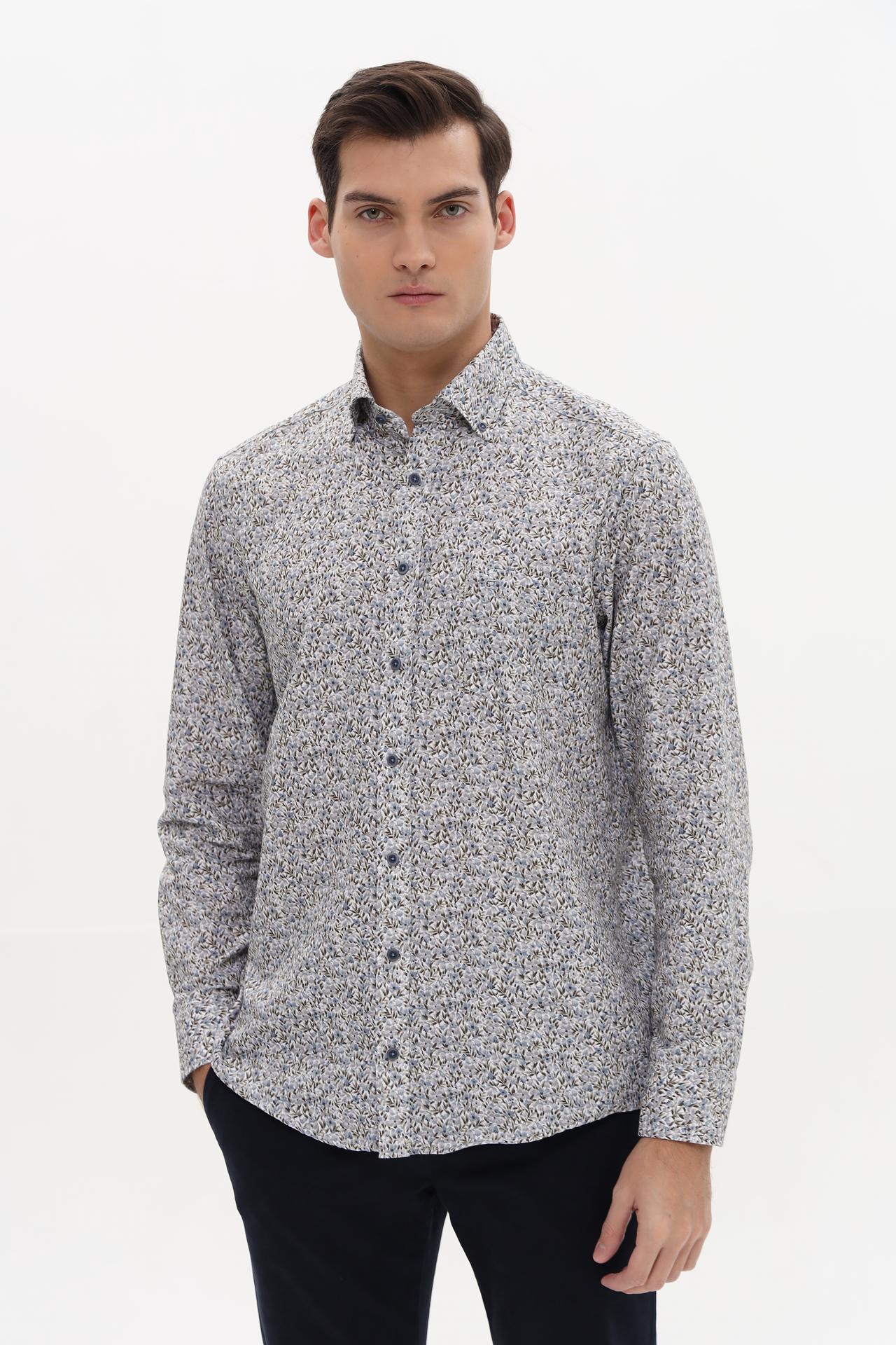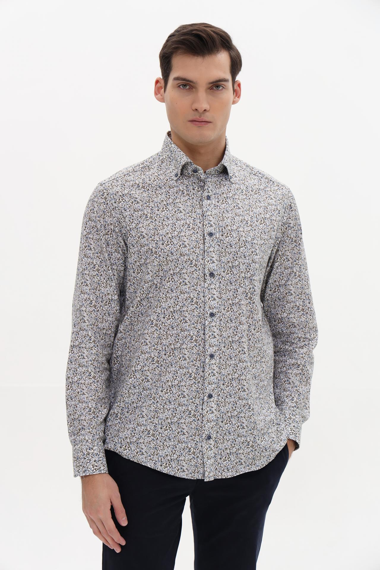 - Элегантный дизайн: Мелкий цветочный узор в сдержанной цветовой гамме (серый, голубой, коричневый) придает рубашке стильный и утонченный вид. Принт гармонично дополняет классический крой.