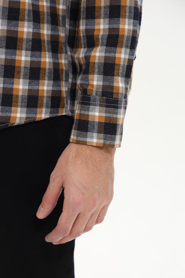 Основной цвет рубашки – тёмно-синий, дополненный горчично-жёлтым и серым клетчатым узором. Такая комбинация цветов делает рубашку универсальной и подходящей для различных образов.