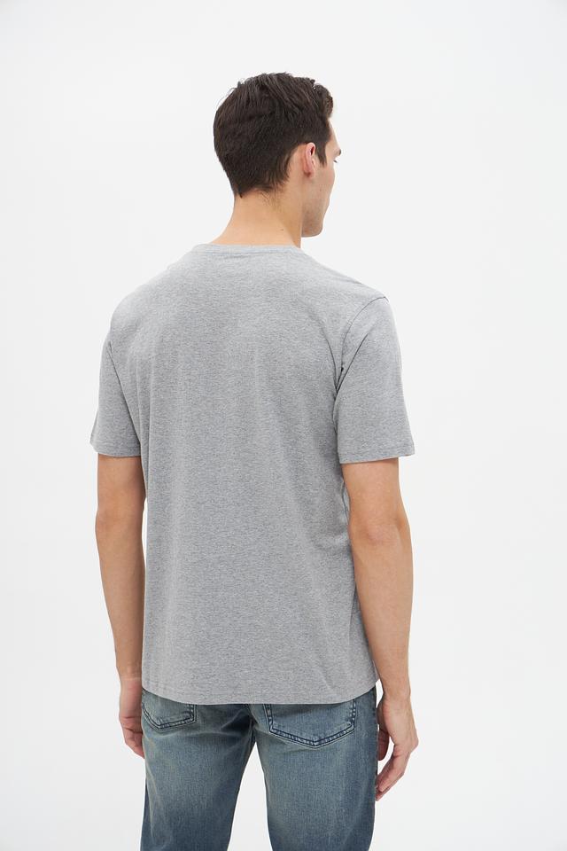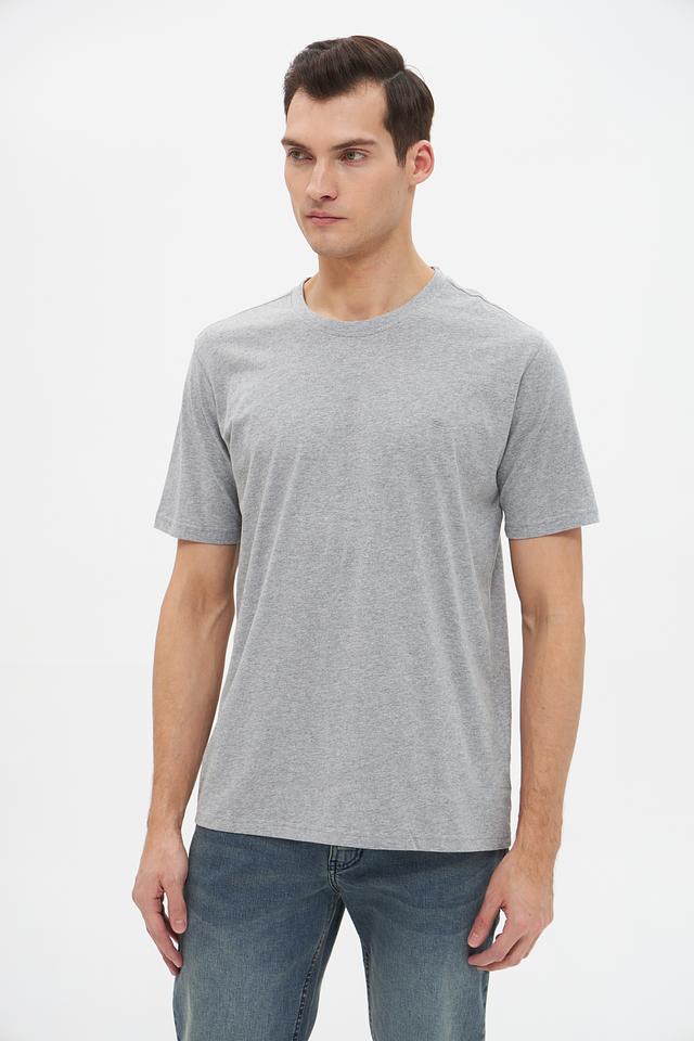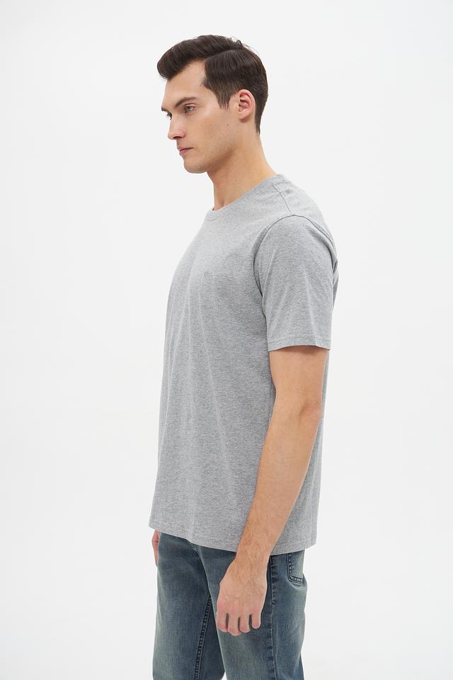 Цвет футболки – серый меланж, что делает ее универсальной и легко сочетаемой с различными элементами гардероба. Округлый вырез горловины и короткие рукава обеспечивают удобство и свободу движений.