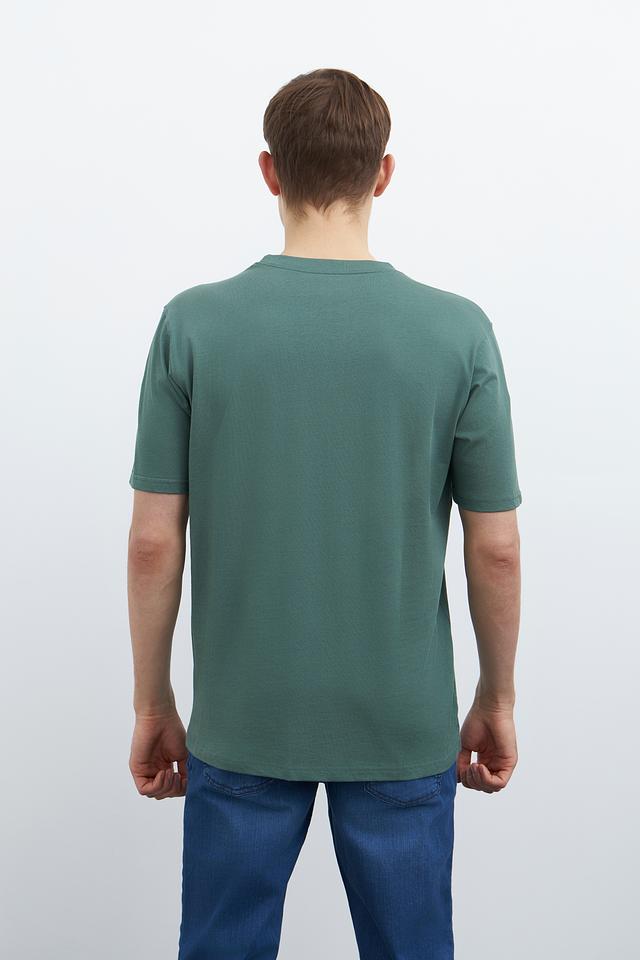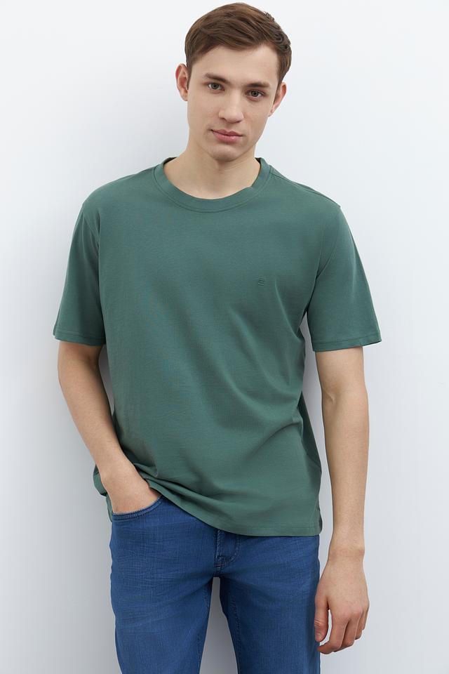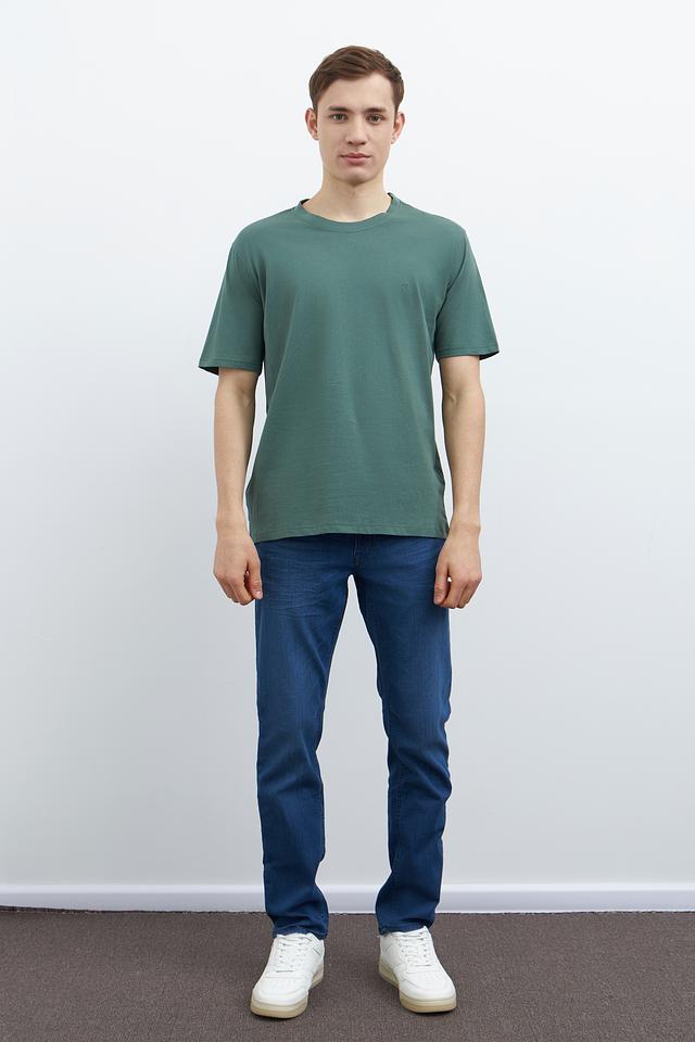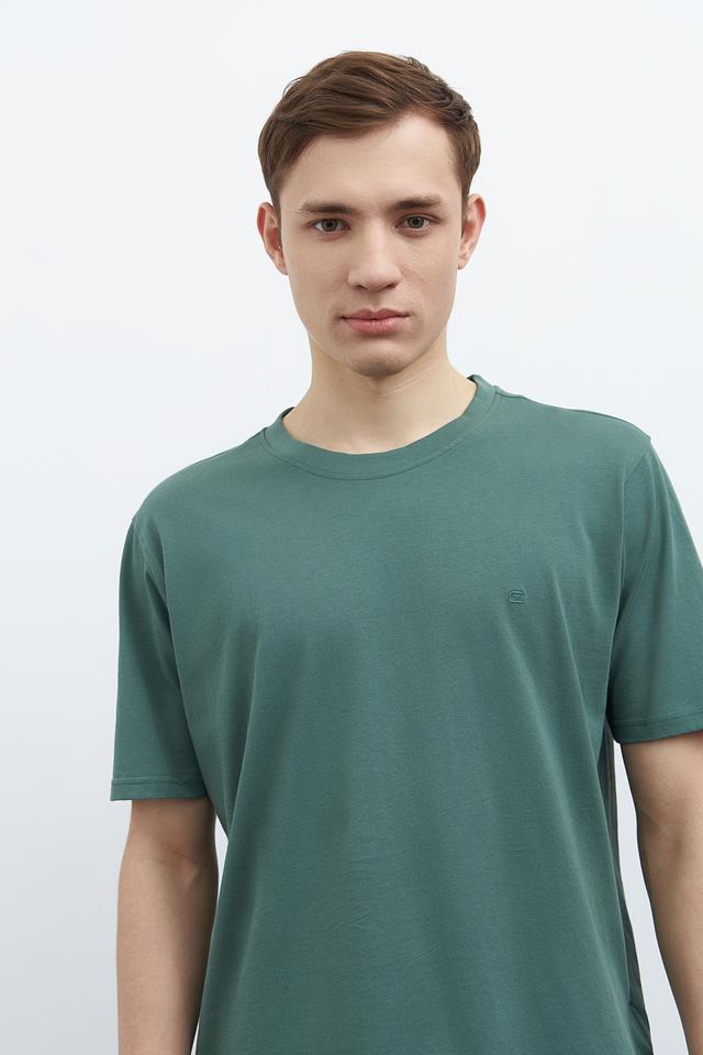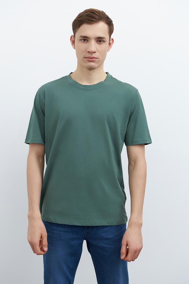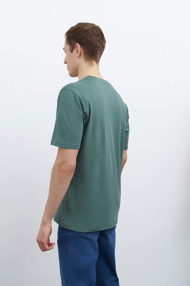 Модель имеет классический прямой крой, который подходит для любого типа фигуры. Футболка выполнена в спокойном зелёном цвете, который легко сочетается с различными элементами гардероба.